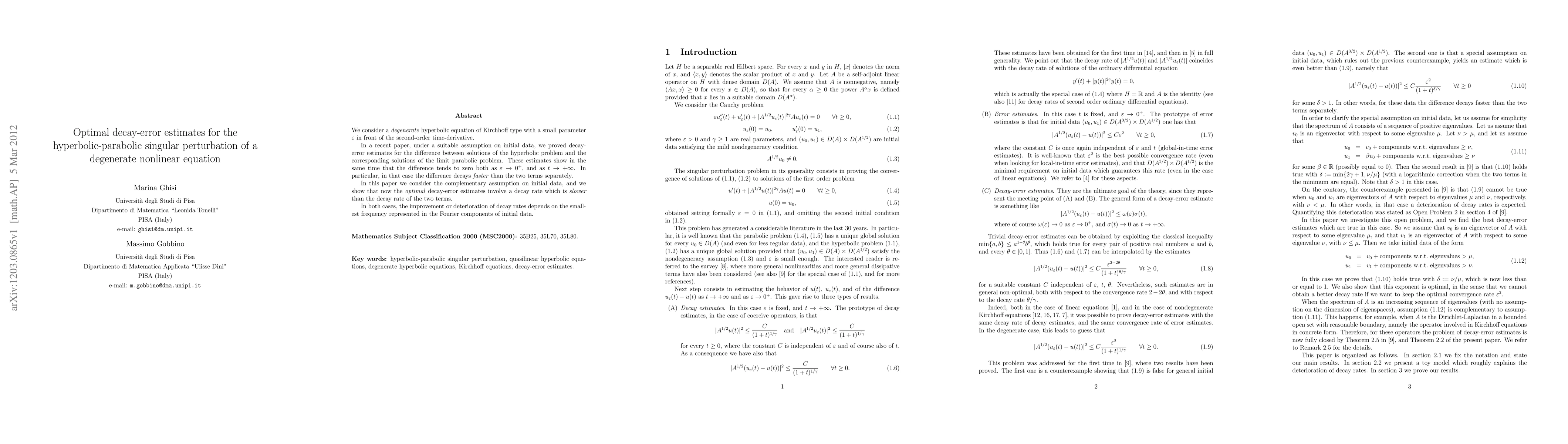 This paper investigates decay-error estimates for a degenerate hyperbolic-parabolic singular perturbation problem, showing that the decay rate of the difference between hyperbolic and parabolic solutions depends on the smallest frequency in the initial data's Fourier components. The study reveals that under complementary initial data assumptions, the decay rate can either improve or deteriorate compared to the individual terms.