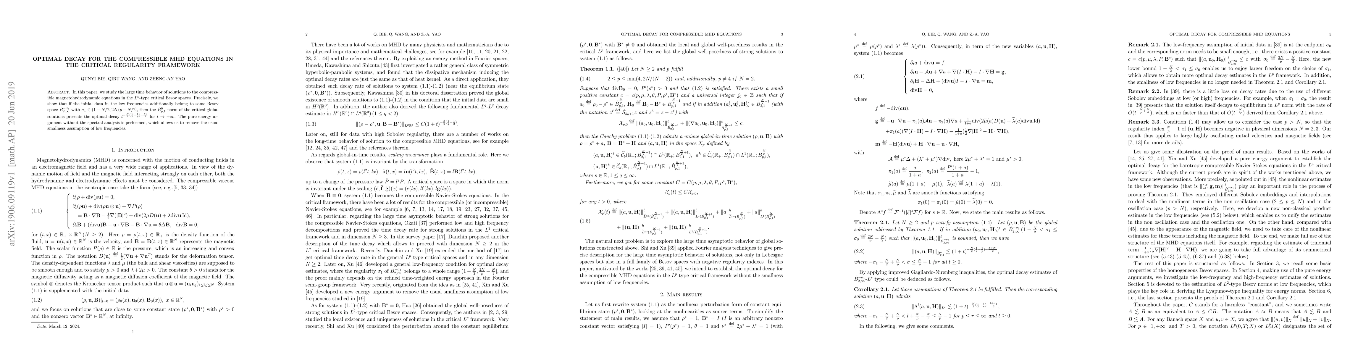 The paper studies optimal decay for compressible MHD equations in critical regularity framework, showing that low-frequency initial data with specific Besov space properties lead to a certain norm of global solutions decaying at a specific rate as time approaches infinity.