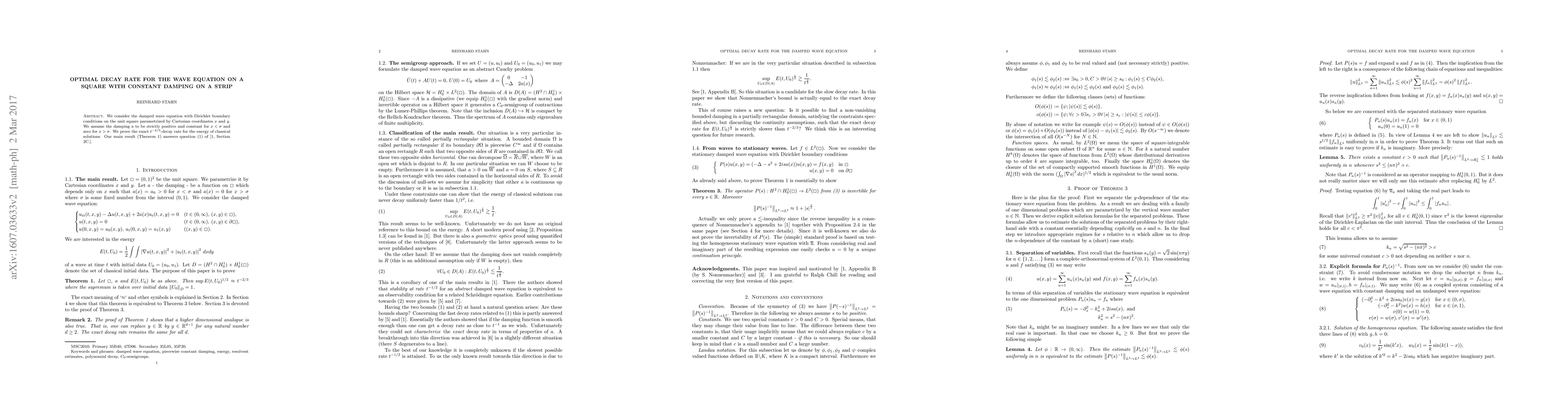This paper proves the exact $t^{-4/3}$-decay rate for the energy of classical solutions to the damped wave equation on a square, with damping concentrated in a strip, answering a question posed by Anantharaman and Léautaud (2014). The result is achieved under Dirichlet boundary conditions.