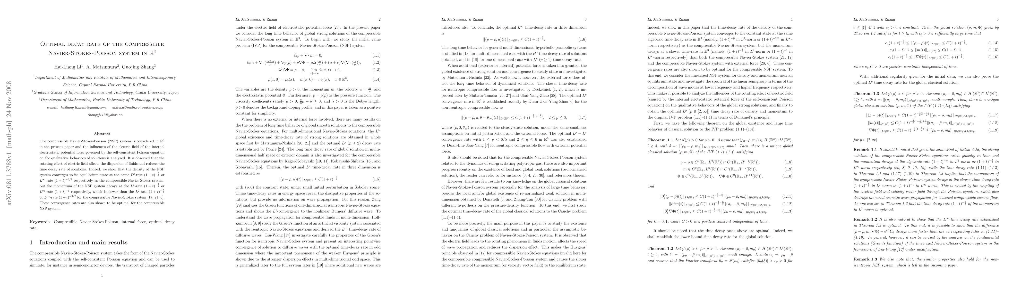 The compressible Navier-Stokes-Poisson (NSP) system is considered in $R^3$ in the present paper and the influences of the electric field of the internal electrostatic potential force governed by the self-consistent Poisson equation on the qualitative behaviors of solutions is analyzed. It is observed that the rotating effect of electric field affects the dispersion of fluids and reduces the time decay rate of solutions. Indeed, we show that the density of the NSP system converges to its equilibrium state at the same $L^2$-rate $(1+t)^{-\frac34}$ or $L^\infty$-rate $(1+t)^{-3/2}$ respectively as the compressible Navier-Stokes system, but the momentum of the NSP system decays at the $L^2$-rate $(1+t)^{-\frac14}$ or $L^\infty$-rate $(1+t)^{-1}$ respectively, which is slower than the $L^2$-rate $(1+t)^{-\frac34}$ or $L^\infty$-rate $(1+t)^{-3/2}$ for the compressible Navier-Stokes system. These convergence rates are also shown to be optimal for the compressible NSP system.