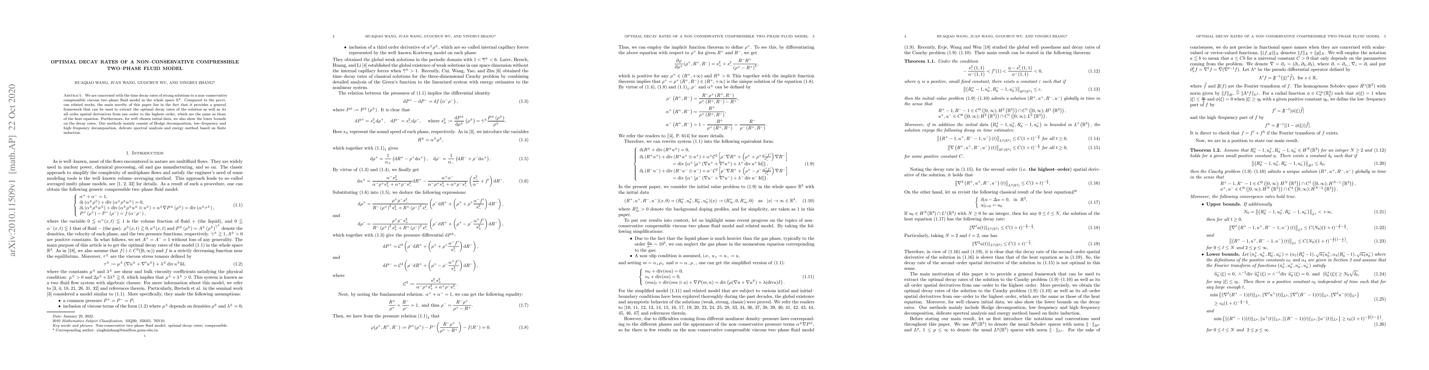 We are concerned with the time decay rates of strong solutions to a non-conservative compressible viscous two-phase fluid model in the whole space R3. Compared to the previous related works, the main novelty of this paper lies in the fact that it provides a general framework that can be used to extract the optimal decay rates of the solution as well as its all-order spatial derivatives from one-order to the highest-order, which are the same as those of the heat equation. Furthermore, for well-chosen initial data, we also show the lower bounds on the decay rates. Our methods mainly consist of Hodge decomposition, low-frequency and high-frequency decomposition, delicate spectral analysis and energy method based on finite induction.