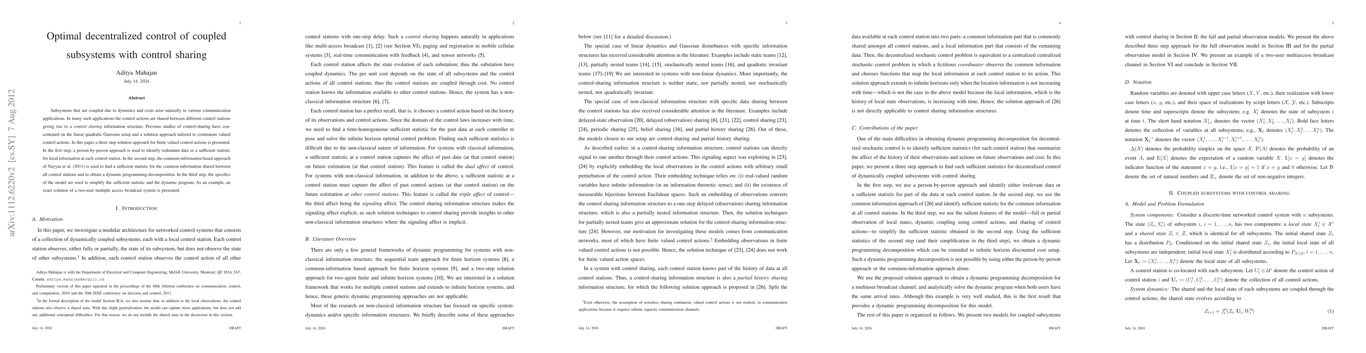 This paper proposes a three-step solution approach for decentralized control of coupled subsystems with finite valued control actions, focusing on control sharing among different stations. It identifies redundant data, derives a sufficient statistic for shared information, and simplifies the dynamic programming decomposition to achieve optimal control.