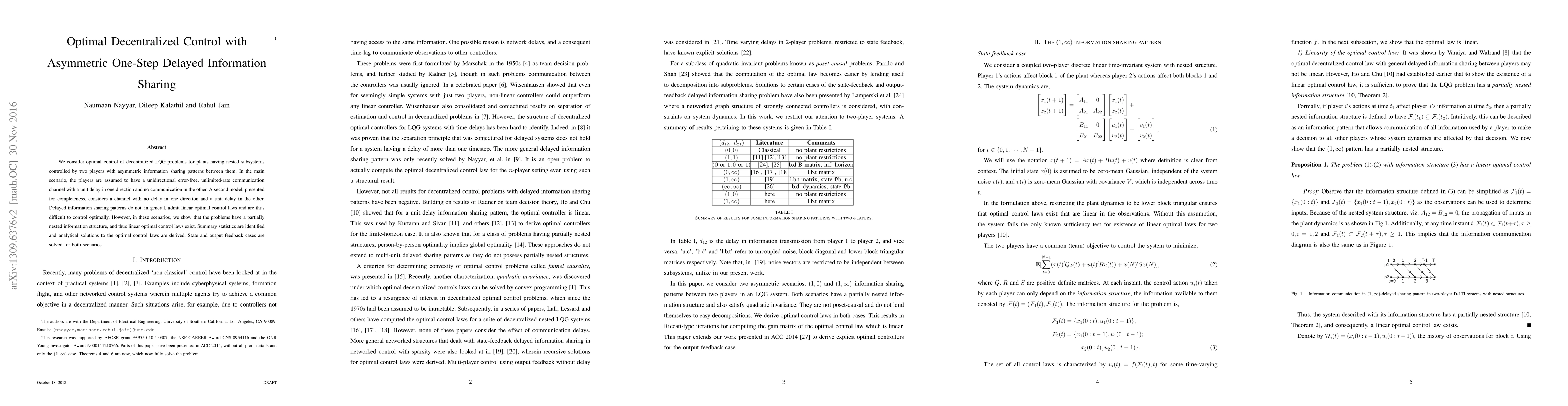 This paper explores optimal decentralized control for LQG systems with asymmetric delayed information sharing between two players. It demonstrates that despite the challenges posed by delayed information, linear optimal control laws exist due to a partially nested information structure, and it formulates deterministic convex optimization problems to derive these laws.
