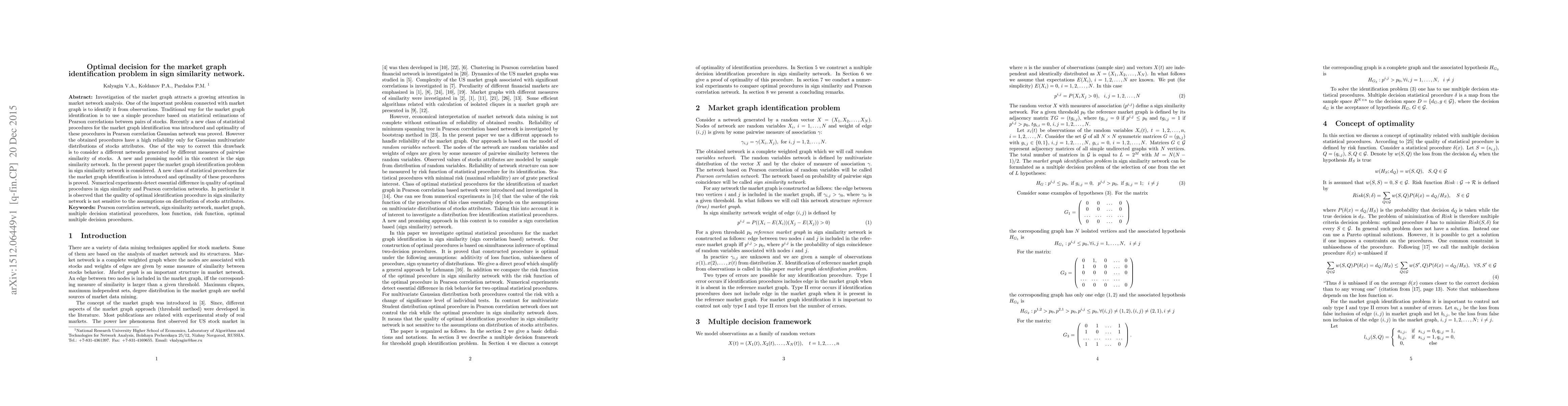 A new class of statistical procedures is introduced to identify market graphs in sign similarity networks, offering improved reliability beyond Gaussian multivariate distributions. Numerical experiments show significant differences in quality between optimal procedures for sign similarity and Pearson correlation networks.