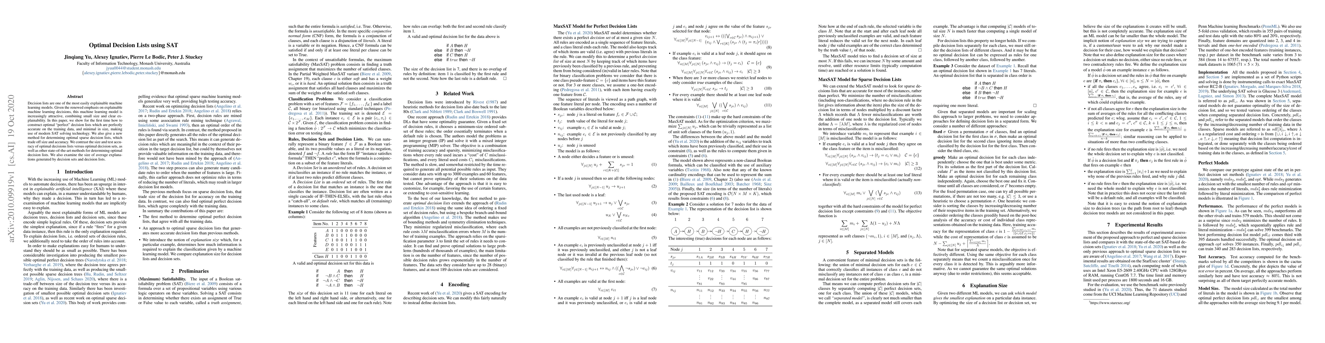 This paper presents a novel method for constructing optimal decision lists using SAT solving technology, achieving perfect accuracy on training data while minimizing size. It also introduces a new approach for finding optimal sparse decision lists, balancing size and accuracy, and compares these with optimal decision sets and other state-of-the-art methods.