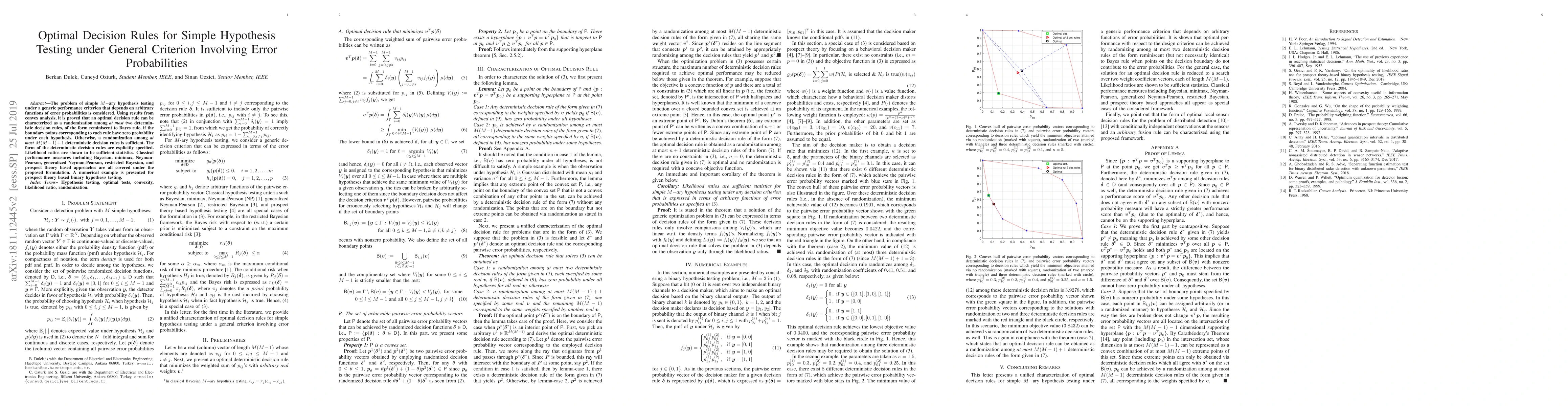The problem of simple $M-$ary hypothesis testing under a generic performance criterion that depends on arbitrary functions of error probabilities is considered. Using results from convex analysis, it is proved that an optimal decision rule can be characterized as a randomization among at most two deterministic decision rules, of the form reminiscent to Bayes rule, if the boundary points corresponding to each rule have zero probability under each hypothesis. Otherwise, a randomization among at most $M(M-1)+1$ deterministic decision rules is sufficient. The form of the deterministic decision rules are explicitly specified. Likelihood ratios are shown to be sufficient statistics. Classical performance measures including Bayesian, minimax, Neyman-Pearson, generalized Neyman-Pearson, restricted Bayesian, and prospect theory based approaches are all covered under the proposed formulation. A numerical example is presented for prospect theory based binary hypothesis testing.