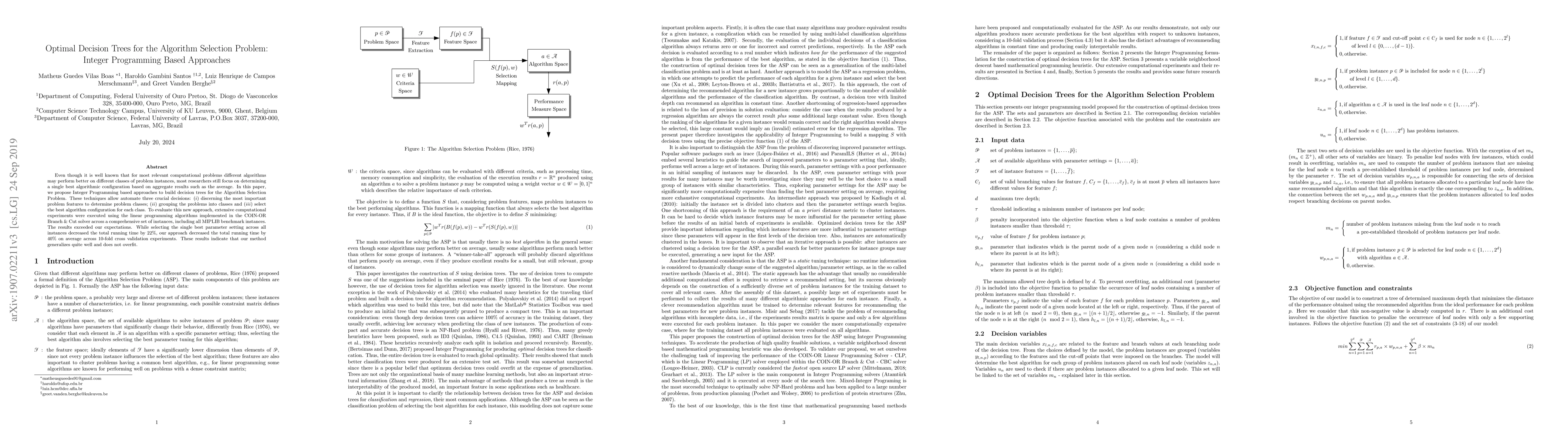 This paper proposes Integer Programming based decision trees to tackle the Algorithm Selection Problem, automating the identification of problem features, classification of problems, and selection of optimal algorithm configurations. Experiments using COIN-OR solvers on MIPLIB instances showed a 40% average reduction in total running time compared to selecting a single best algorithm, indicating strong generalization.