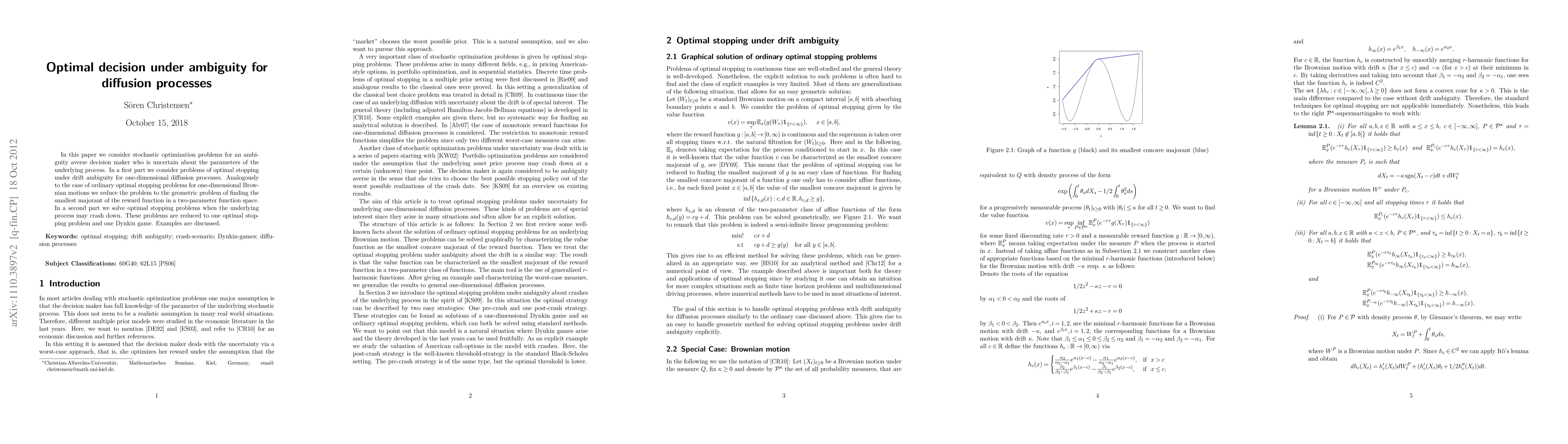 This paper explores stochastic optimization for ambiguity-averse decision makers uncertain about diffusion process parameters, focusing on optimal stopping under drift ambiguity and crash scenarios, reducing these problems to geometric and Dynkin game formulations. Examples illustrate the practical application of the proposed solutions.