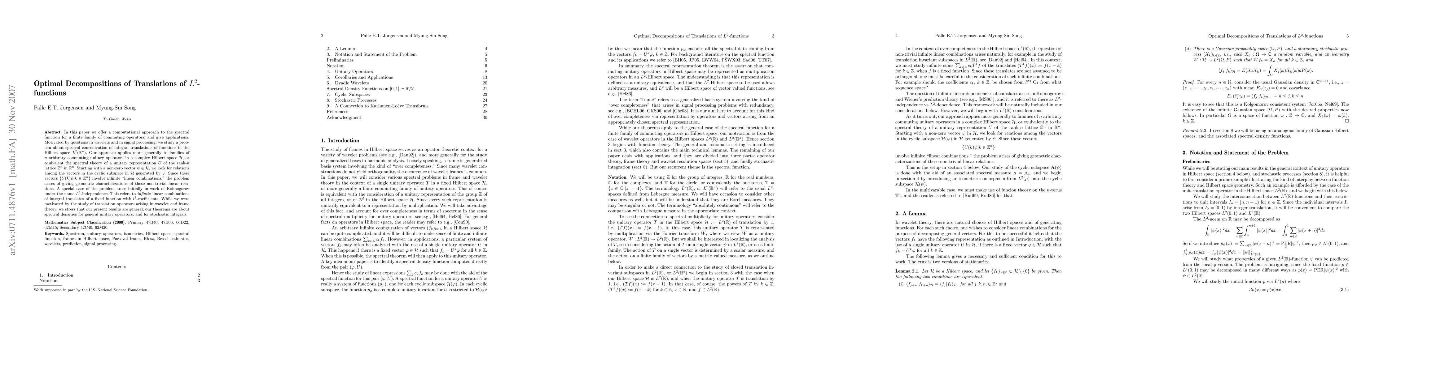 In this paper we offer a computational approach to the spectral function for a finite family of commuting operators, and give applications. Motivated by questions in wavelets and in signal processing, we study a problem about spectral concentration of integral translations of functions in the Hilbert space $L^{2}(\mathbb{R}^{n})$. Our approach applies more generally to families of $n$ arbitrary commuting unitary operators in a complex Hilbert space $\mathcal{H}$, or equivalent the spectral theory of a unitary representation $U$ of the rank-$n$ lattice $\mathbb{Z}^{n}$ in $\mathbb{R}^{n}$. Starting with a non-zero vector $\psi \in \mathcal{H}$, we look for relations among the vectors in the cyclic subspace in $\mathcal{H}$ generated by $\psi$. Since these vectors $\{U(k)\psi | k \in \mathbb{Z}^{n}\}$ involve infinite ``linear combinations," the problem arises of giving geometric characterizations of these non-trivial linear relations. A special case of the problem arose initially in work of Kolmogorov under the name $L^{2}$-independence. This refers to \textit{infinite} linear combinations of integral translates of a fixed function with $l^{2}$-coefficients. While we were motivated by the study of translation operators arising in wavelet and frame theory, we stress that our present results are general; our theorems are about spectral densities for general unitary operators, and for stochastic integrals.