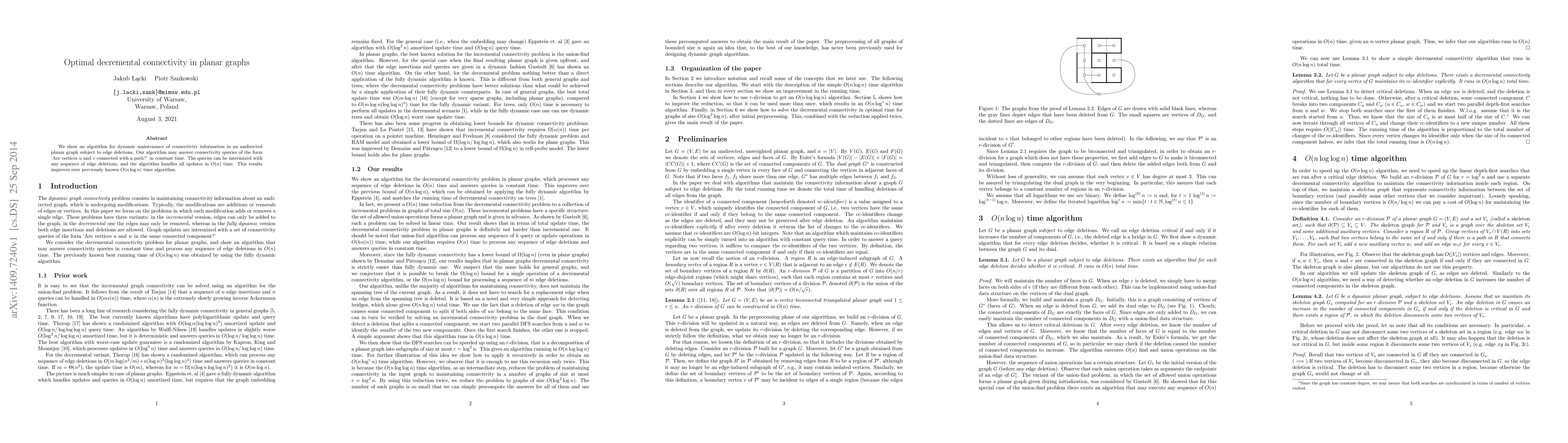 We show an algorithm for dynamic maintenance of connectivity information in an undirected planar graph subject to edge deletions. Our algorithm may answer connectivity queries of the form `Are vertices $u$ and $v$ connected with a path?' in constant time. The queries can be intermixed with any sequence of edge deletions, and the algorithm handles all updates in $O(n)$ time. This results improves over previously known $O(n \log n)$ time algorithm.