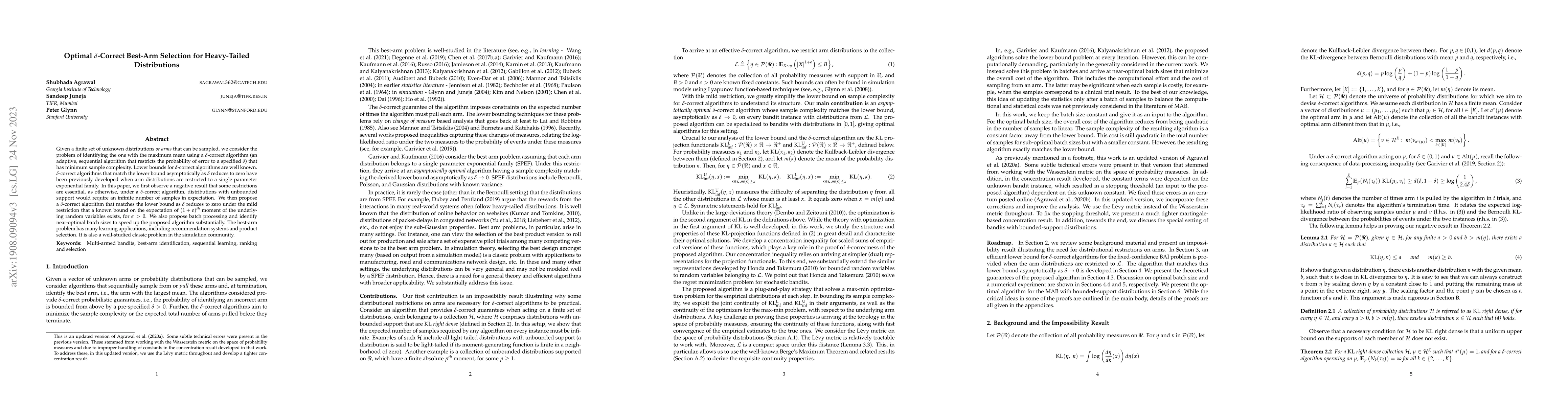 Given a finite set of unknown distributions or arms that can be sampled, we consider the problem of identifying the one with the maximum mean using a $\delta$-correct algorithm (an adaptive, sequential algorithm that restricts the probability of error to a specified $\delta$) that has minimum sample complexity. Lower bounds for $\delta$-correct algorithms are well known. $\delta$-correct algorithms that match the lower bound asymptotically as $\delta$ reduces to zero have been previously developed when arm distributions are restricted to a single parameter exponential family. In this paper, we first observe a negative result that some restrictions are essential, as otherwise, under a $\delta$-correct algorithm, distributions with unbounded support would require an infinite number of samples in expectation. We then propose a $\delta$-correct algorithm that matches the lower bound as $\delta$ reduces to zero under the mild restriction that a known bound on the expectation of $(1+\epsilon)^{th}$ moment of the underlying random variables exists, for $\epsilon > 0$. We also propose batch processing and identify near-optimal batch sizes to speed up the proposed algorithm substantially. The best-arm problem has many learning applications, including recommendation systems and product selection. It is also a well-studied classic problem in the simulation community.