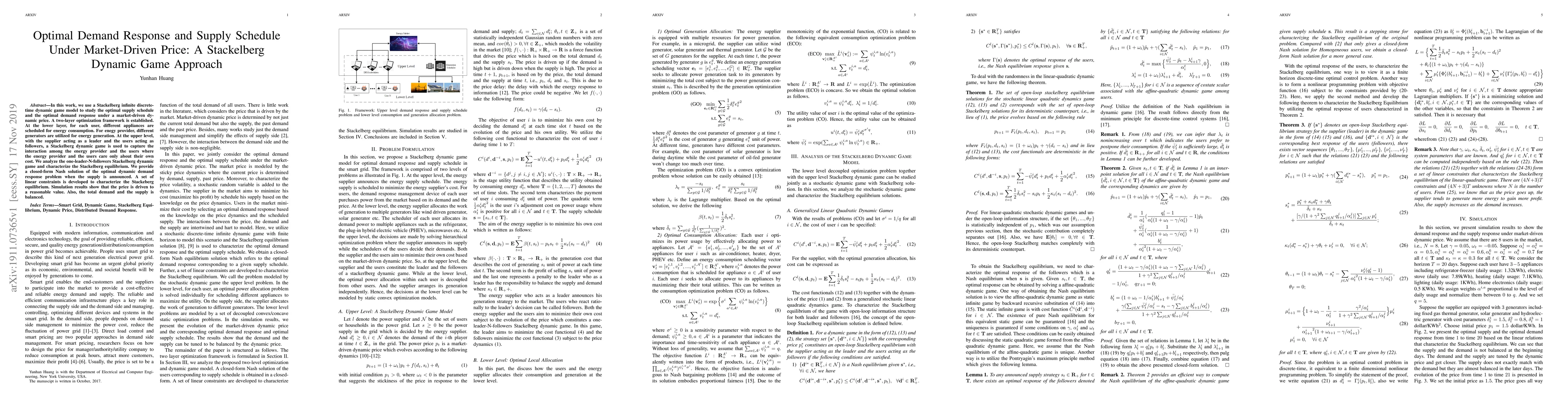 This paper employs a Stackelberg dynamic game model to optimize energy supply schedules and demand response under market-driven prices, establishing a two-layer optimization framework. It characterizes the Stackelberg equilibrium and provides a closed-form Nash solution for optimal dynamic demand response, demonstrating balanced supply and demand through simulations.