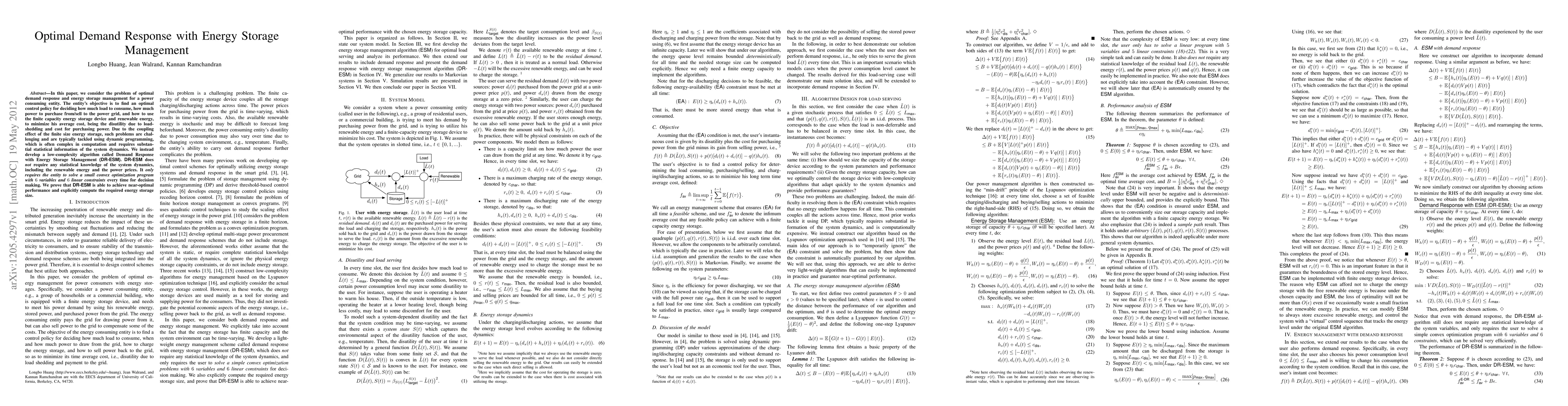 In this paper, we consider the problem of optimal demand response and energy storage management for a power consuming entity. The entity's objective is to find an optimal control policy for deciding how much load to consume, how much power to purchase from/sell to the power grid, and how to use the finite capacity energy storage device and renewable energy, to minimize his average cost, being the disutility due to load- shedding and cost for purchasing power. Due to the coupling effect of the finite size energy storage, such problems are challenging and are typically tackled using dynamic programming, which is often complex in computation and requires substantial statistical information of the system dynamics. We instead develop a low-complexity algorithm called Demand Response with Energy Storage Management (DR-ESM). DR-ESM does not require any statistical knowledge of the system dynamics, including the renewable energy and the power prices. It only requires the entity to solve a small convex optimization program with 6 variables and 6 linear constraints every time for decision making. We prove that DR-ESM is able to achieve near-optimal performance and explicitly compute the required energy storage size.