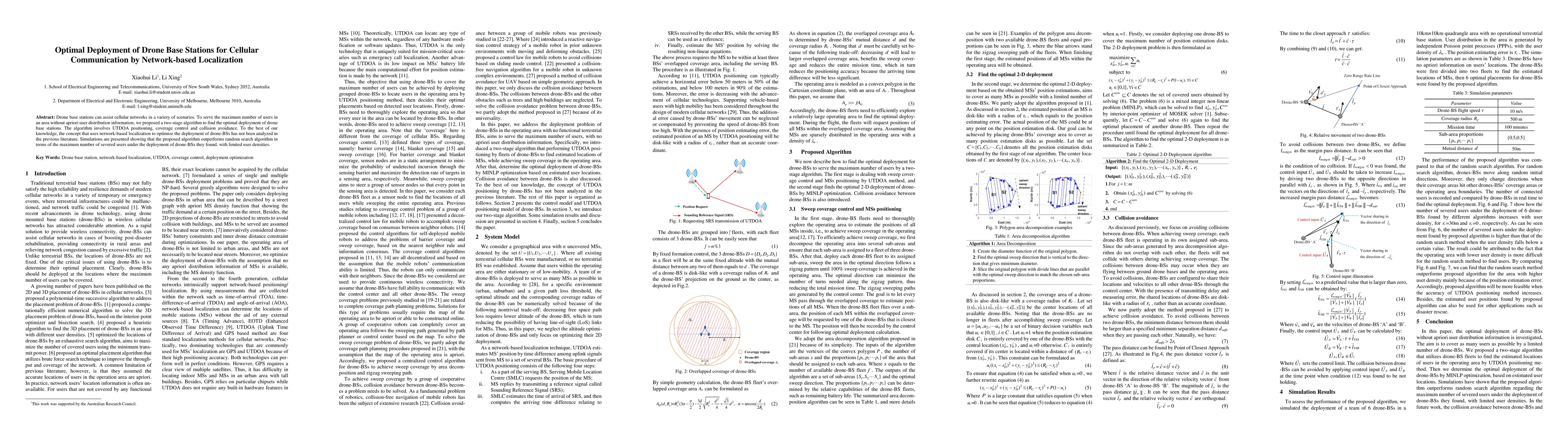 Drone base stations can assist cellular networks in a variety of scenarios. To serve the maximum number of users in an area without apriori user distribution information, we proposed a two-stage algorithm to find the optimal deployment of drone base stations. The algorithm involves UTDOA positioning, coverage control and collision avoidance. To the best of our knowledge, the concept that uses network-based localization to optimize the deployment of drone-BSs has not been analyzed in the previous literature. Simulations are presented showing that the proposed algorithm outperforms random search algorithm in terms of the maximum number of severed users under the deployment of drone-BSs they found, with limited user densities.