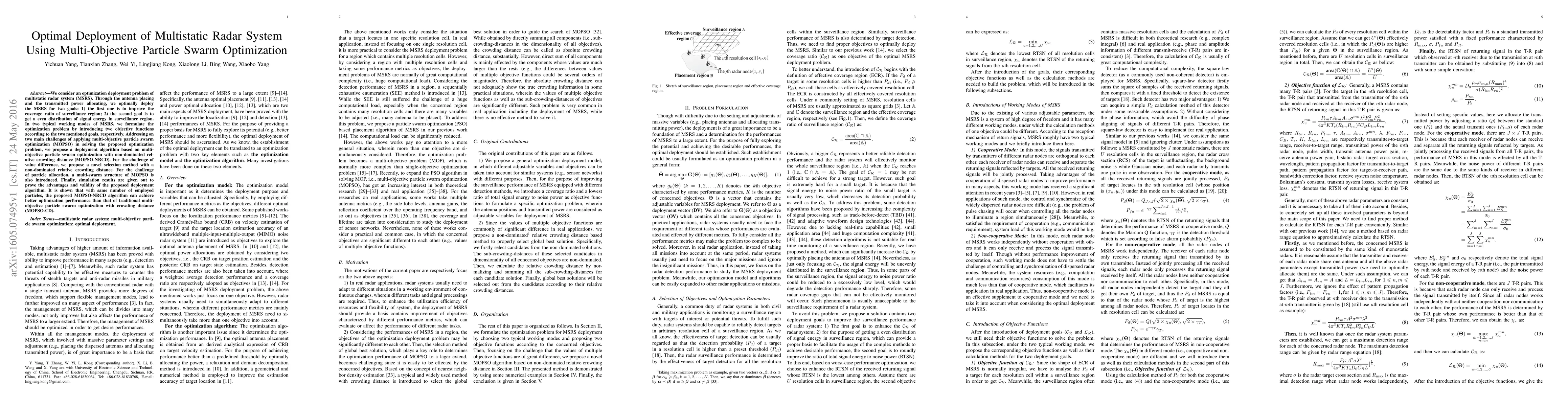 This paper proposes a multi-objective particle swarm optimization (MOPSO-NRCD) algorithm for optimal deployment of a multistatic radar system, focusing on improving surveillance coverage and even signal energy distribution. The algorithm addresses challenges in MOPSO through a novel selection method and a multi-swarm structure, demonstrating superior performance compared to traditional MOPSO-CD in simulations.