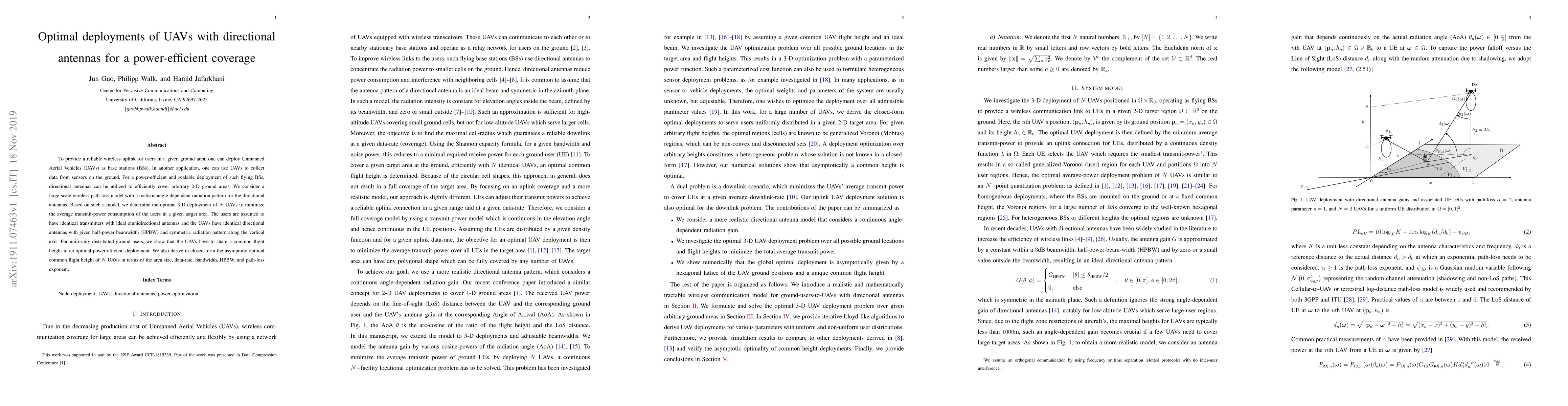 This paper investigates the optimal deployment of Unmanned Aerial Vehicles (UAVs) equipped with directional antennas for power-efficient coverage of a given ground area. The study determines the optimal 3-D configuration of UAVs to minimize transmit power, deriving a closed-form expression for the asymptotic optimal common flight height based on area size, data-rate, bandwidth, and antenna parameters.