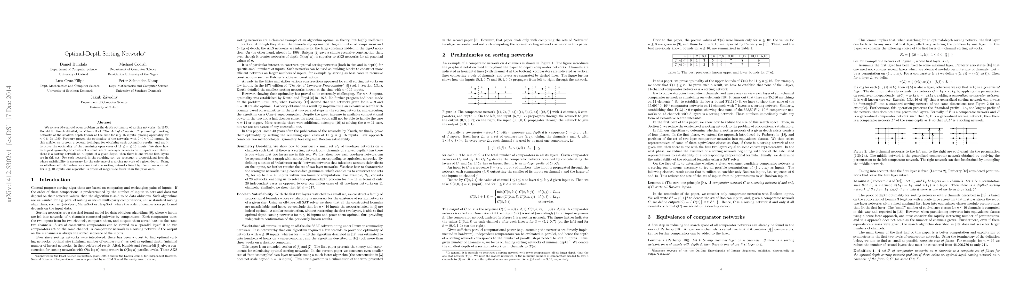 This paper resolves a 40-year-old open problem by proving the optimality of sorting networks for 11 ≤ n ≤ 16 inputs, extending previous results by Knuth and Parberry. The authors employ a novel technique involving symmetry and SAT solvers to validate the minimal depth of these networks.