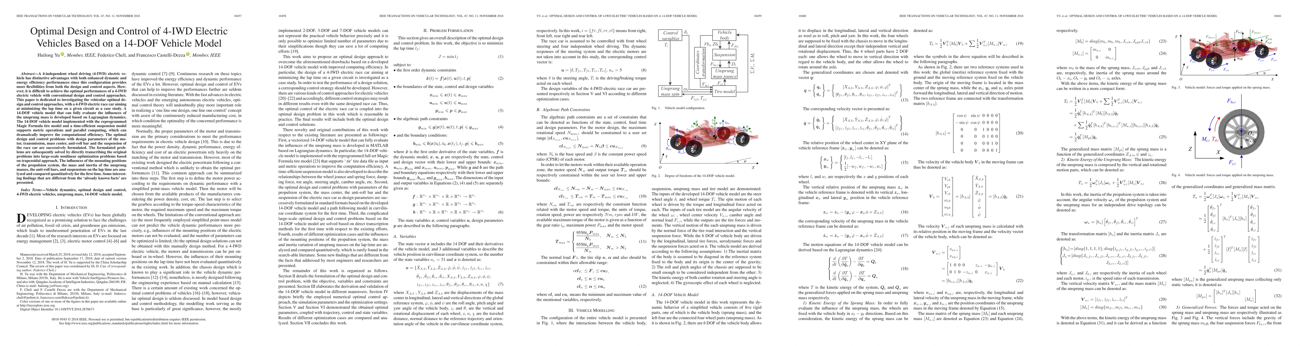 A 4-independent wheel driving (4-IWD) electric vehicle has distinctive advantages with both enhanced dynamic and energy efficiency performances since this configuration provides more flexibilities from both the design and control aspects. However, it is difficult to achieve the optimal performances of a 4-IWD electric vehicle with conventional design and control approaches. This work is dedicated to investigating the vehicular optimal design and control approaches, with a 4-IWD electric race car aiming at minimizing the lap time on a given circuit as a case study. A 14-DOF vehicle model that can fully evaluate the influences of the unsprung mass is developed based on Lagrangian dynamics. The 14-DOF vehicle model implemented with the reprogrammed Magic Formula tire model and a time-efficient suspension model supports metric operations and parallel computing, which can dramatically improve the computational efficiency. The optimal design and control problems with design parameters of the motor, transmission, mass center, anti-roll bar and the suspension of the race car are successively formulated. The formulated problems are subsequently solved by directly transcribing the original problems into large scale nonlinear optimization problems based on trapezoidal approach. The influences of the mounting positions of the propulsion system, the mass and inertia of the unsprung masses, the anti-roll bars and suspensions on the lap time are analyzed and compared quantitatively. Some interesting findings that are different from the `already known facts' are presented.