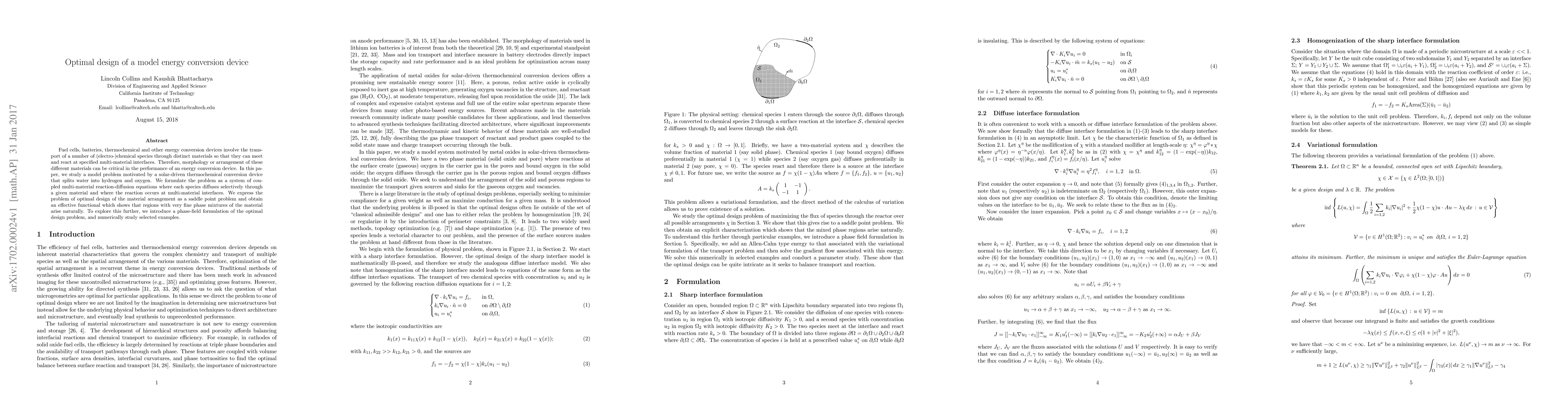 Fuel cells, batteries, thermochemical and other energy conversion devices involve the transport of a number of (electro-)chemical species through distinct materials so that they can meet and react at specified multi-material interfaces. Therefore, morphology or arrangement of these different materials can be critical in the performance of an energy conversion device. In this paper, we study a model problem motivated by a solar-driven thermochemical conversion device that splits water into hydrogen and oxygen. We formulate the problem as a system of coupled multi-material reaction-diffusion equations where each species diffuses selectively through a given material and where the reaction occurs at multi-material interfaces. We express the problem of optimal design of the material arrangement as a saddle point problem and obtain an effective functional which shows that regions with very fine phase mixtures of the material arise naturally. To explore this further, we introduce a phase-field formulation of the optimal design problem, and numerically study selected examples.