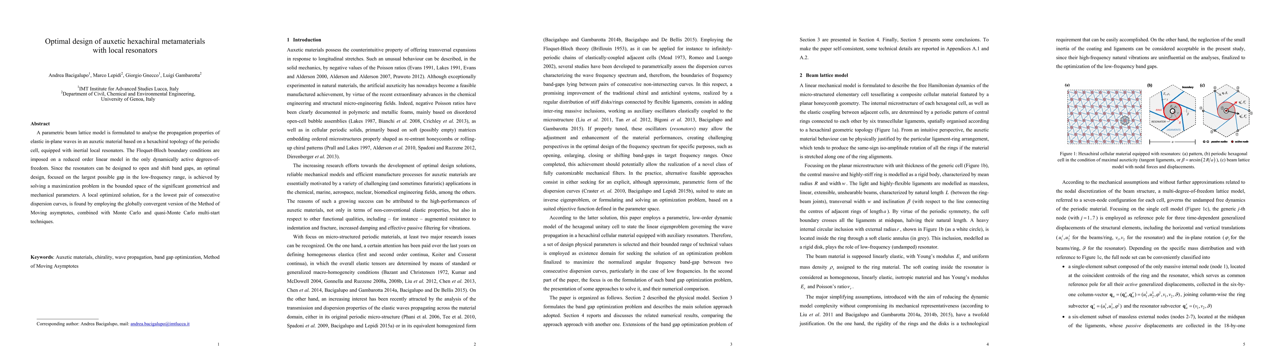 A parametric beam lattice model is formulated to analyse the propagation properties of elastic in-plane waves in an auxetic material based on a hexachiral topology of the periodic cell, equipped with inertial local resonators. The Floquet-Bloch boundary conditions are imposed on a reduced order linear model in the only dynamically active degrees-offreedom. Since the resonators can be designed to open and shift band gaps, an optimal design, focused on the largest possible gap in the low-frequency range, is achieved by solving a maximization problem in the bounded space of the significant geometrical and mechanical parameters. A local optimized solution, for a the lowest pair of consecutive dispersion curves, is found by employing the globally convergent version of the Method of Moving asymptotes, combined with Monte Carlo and quasi-Monte Carlo multi-start techniques.