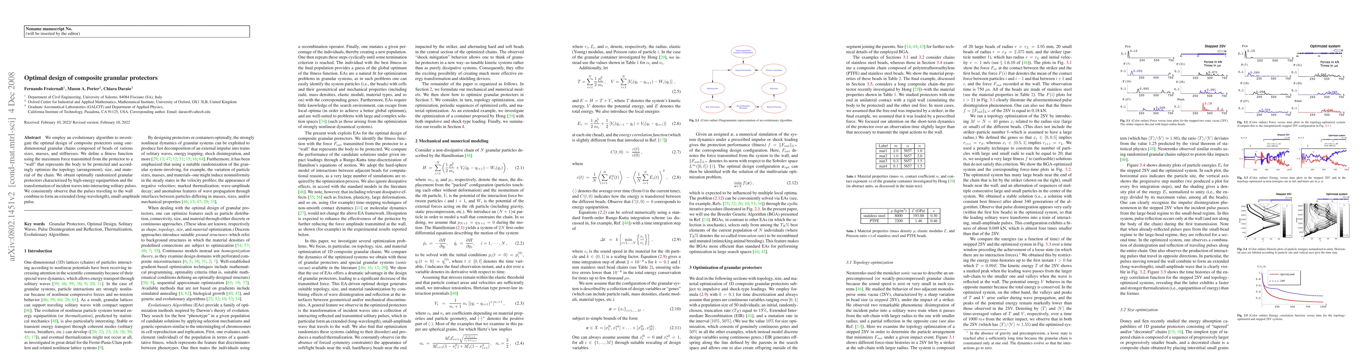 This research uses an evolutionary algorithm to optimize the design of composite protectors made from granular chains. The study focuses on arranging, sizing, and selecting materials for beads in these chains to maximize energy distribution and transform incident waves into solitary pulses, resulting in minimal force transmission to the protected body.