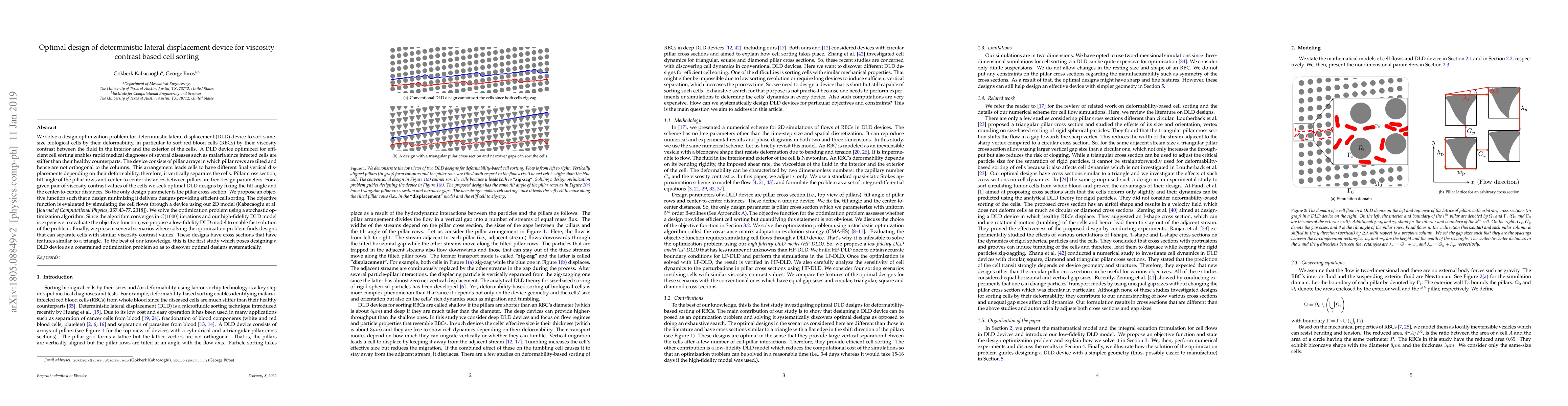 We solve a design optimization problem for deterministic lateral displacement (DLD) device to sort same-size biological cells by their deformability, in particular to sort red blood cells (RBCs) by their viscosity contrast between the fluid in the interior and the exterior of the cells. A DLD device optimized for efficient cell sorting enables rapid medical diagnoses of several diseases such as malaria since infected cells are stiffer than their healthy counterparts. The device consists of pillar arrays in which pillar rows are tilted and hence are not orthogonal to the columns. This arrangement leads cells to have different final vertical displacements depending on their deformability, therefore, it vertically separates the cells. Pillar cross section, tilt angle of the pillar rows and center-to-center distances between pillars define a unique device. For a given pair of viscosity contrast values of the cells we seek optimal DLD designs by fixing the tilt angle and the center-to-center distances. So the only design parameter is the pillar cross section which we parameterize with uniform 5th order B-splines. We propose an objective function to try to capture efficient cell sorting. The objective function is evaluated by simulating the cell flows through a device using our 2D model based on a boundary integral method (Kabacaoglu et al. Journal of Computational Physics, 357:43-77, 2018). We solve the optimization problem using the covariance matrix adaptation evolution strategy (CMA-ES), which is a stochastic, derivative-free algorithm. We present several scenarios where solving the optimization problem finds designs that can separate cells with similar viscosity contrast values. To the best of our knowledge, this is the first study which poses designing a DLD device as a constrained optimization problem and shows that solving this problem systematically discovers optimal designs.