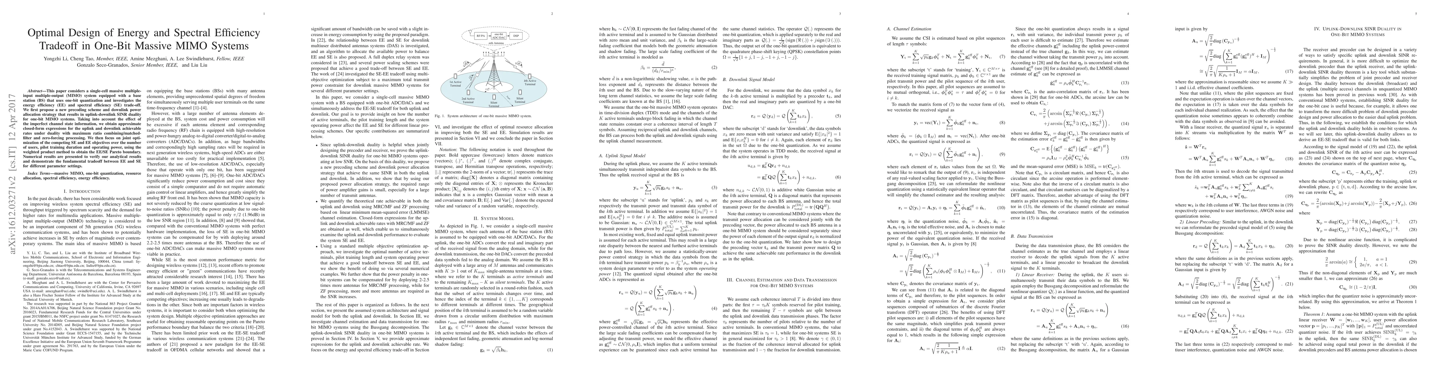 This paper proposes a precoding scheme and power allocation strategy for one-bit massive MIMO systems, enabling uplink-downlink SINR duality. It optimizes energy and spectral efficiency trade-offs through joint optimization of users, pilot training, and power, presenting analytical and numerical results to illustrate the EE/SE Pareto boundary.