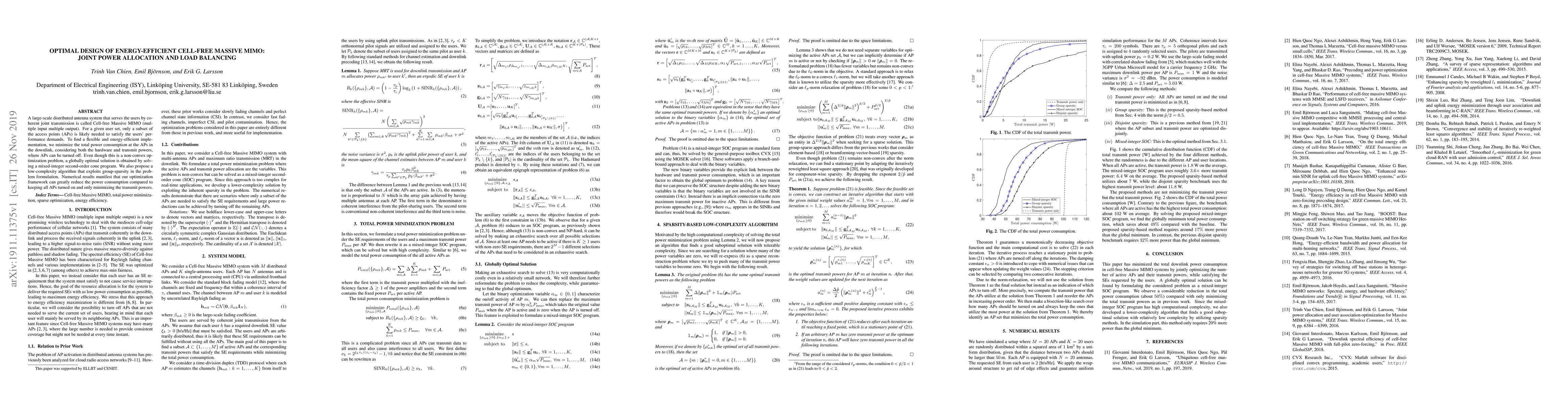 This paper proposes an optimal design for energy-efficient Cell-free Massive MIMO systems by jointly minimizing power allocation and load balancing. A mixed-integer second-order cone program is used to achieve a globally optimal solution, while a low-complexity algorithm leverages group-sparsity to reduce computational complexity, significantly lowering power consumption compared to traditional methods.