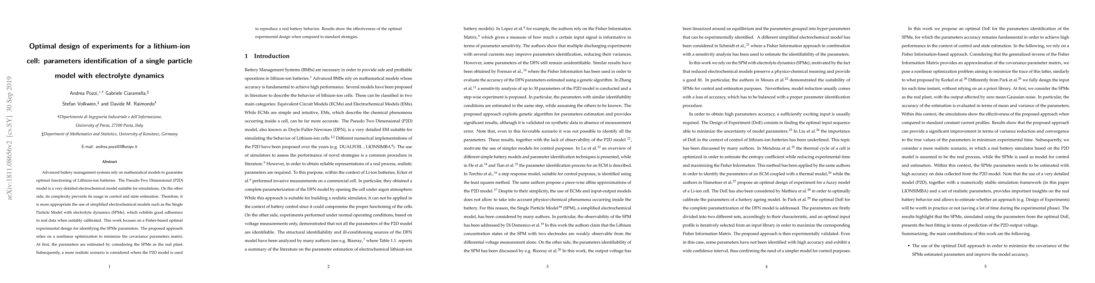 This paper explores optimal experimental design for identifying parameters in a simplified Single Particle Model with electrolyte dynamics for lithium-ion cells, using a Fisher-based approach. Results demonstrate the effectiveness of this method compared to standard strategies, showing better calibration when compared to a more complex Pseudo-Two Dimensional model.