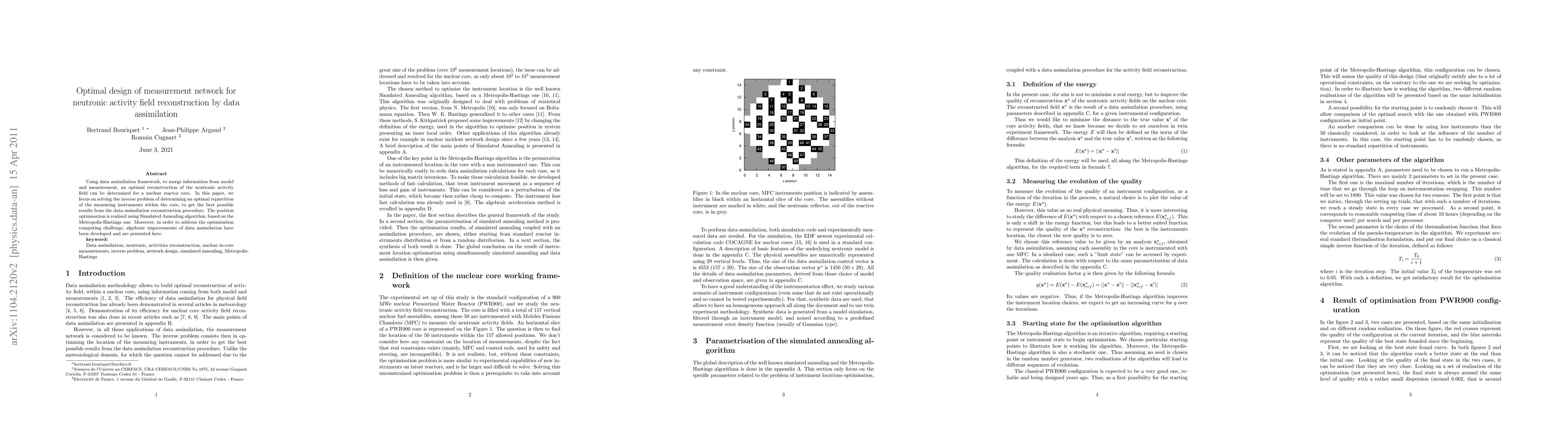 This paper uses data assimilation to optimize measurement network design for reconstructing neutronic activity fields in nuclear reactors. It develops new algorithms and methods to improve data assimilation and solve the inverse problem of instrument placement optimization using simulated annealing.