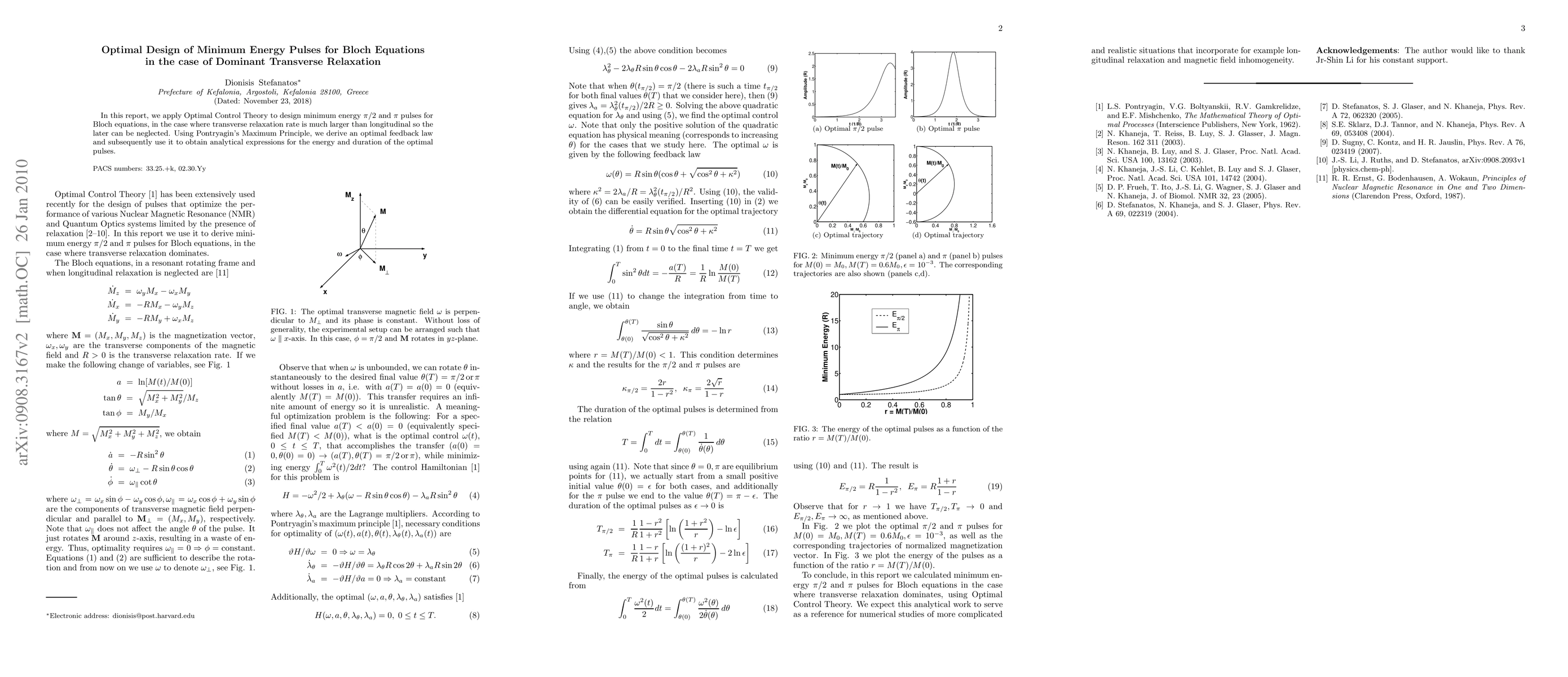In this report, we apply Optimal Control Theory to design minimum energy $\pi/2$ and $\pi$ pulses for Bloch equations, in the case where transverse relaxation rate is much larger than longitudinal so the later can be neglected. Using Pontryagin's Maximum Principle, we derive an optimal feedback law and subsequently use it to obtain analytical expressions for the energy and duration of the optimal pulses.