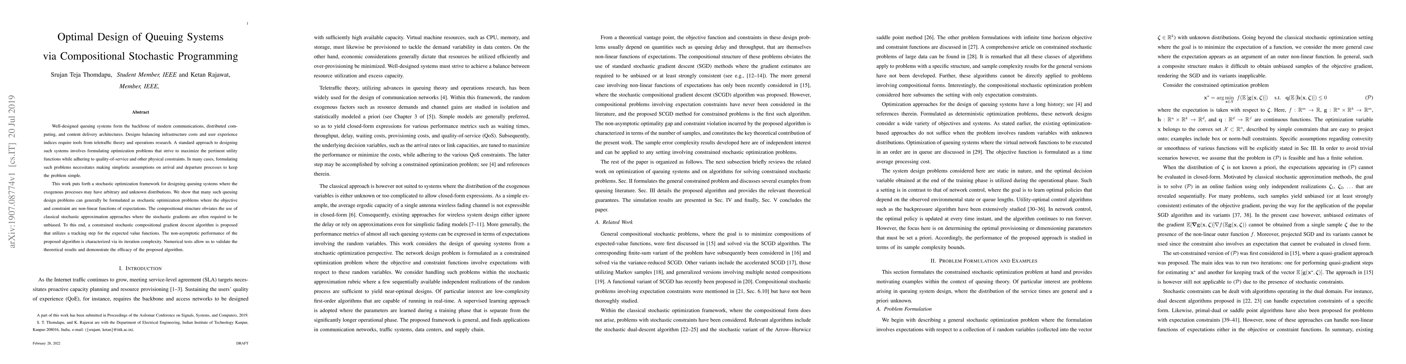 Well-designed queuing systems form the backbone of modern communications, distributed computing, and content delivery architectures. Designs balancing infrastructure costs and user experience indices require tools from teletraffic theory and operations research. A standard approach to designing such systems involves formulating optimization problems that strive to maximize the pertinent utility functions while adhering to quality-of-service and other physical constraints. In many cases, formulating such problems necessitates making simplistic assumptions on arrival and departure processes to keep the problem simple. This work puts forth a stochastic optimization framework for designing queuing systems where the exogenous processes may have arbitrary and unknown distributions. We show that many such queuing design problems can generally be formulated as stochastic optimization problems where the objective and constraint are non-linear functions of expectations. The compositional structure obviates the use of classical stochastic approximation approaches where the stochastic gradients are often required to be unbiased. To this end, a constrained stochastic compositional gradient descent algorithm is proposed that utilizes a tracking step for the expected value functions. The non-asymptotic performance of the proposed algorithm is characterized via its iteration complexity. Numerical tests allow us to validate the theoretical results and demonstrate the efficacy of the proposed algorithm.