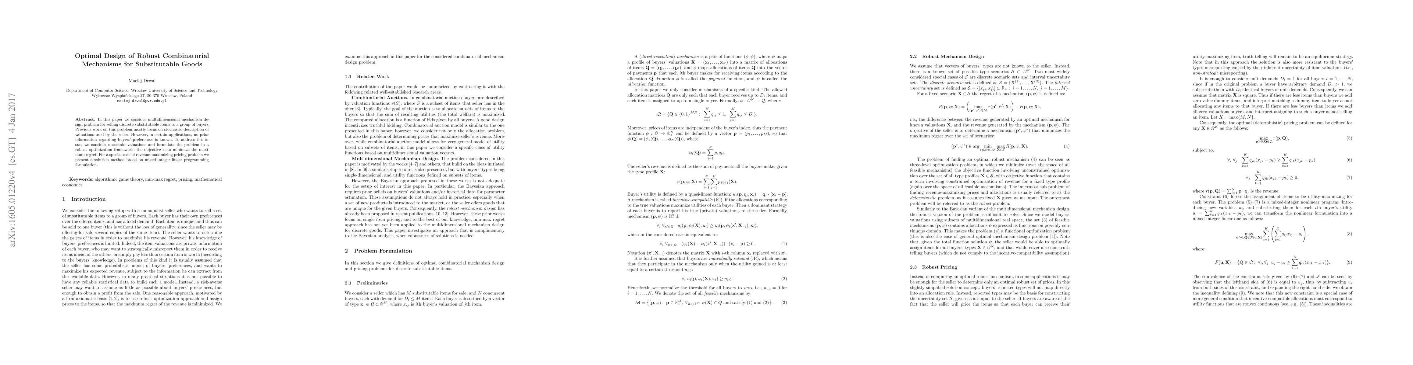 In this paper we consider multidimensional mechanism design problem for selling discrete substitutable items to a group of buyers. Previous work on this problem mostly focus on stochastic description of valuations used by the seller. However, in certain applications, no prior information regarding buyers' preferences is known. To address this issue, we consider uncertain valuations and formulate the problem in a robust optimization framework: the objective is to minimize the maximum regret. For a special case of revenue-maximizing pricing problem we present a solution method based on mixed-integer linear programming formulation.