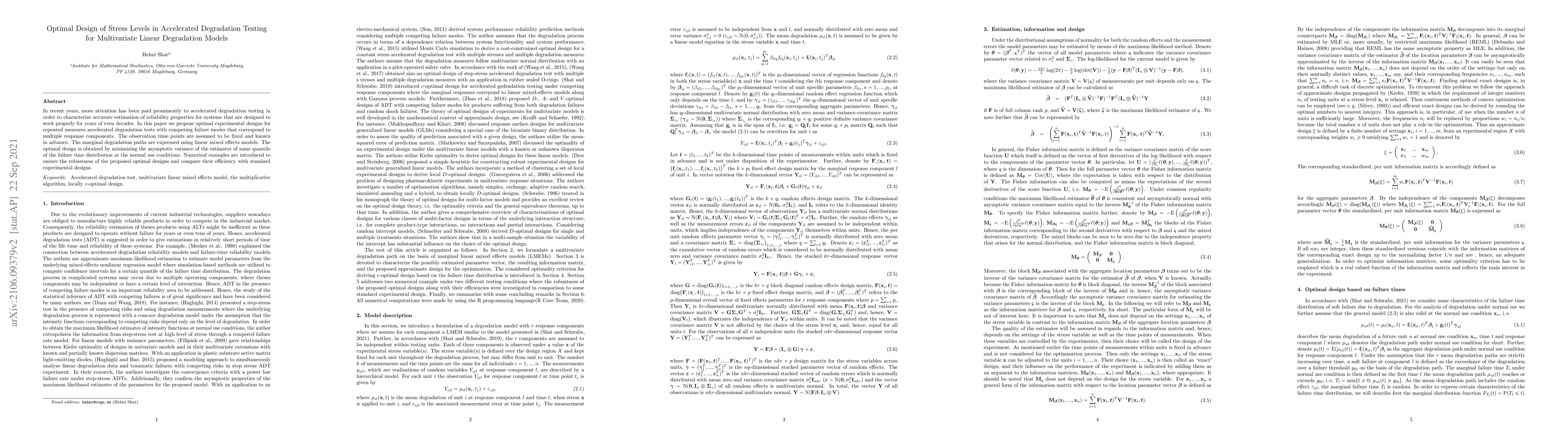 This paper proposes optimal experimental designs for accelerated degradation testing under multivariate linear degradation models, aiming to accurately estimate reliability properties. The designs minimize the asymptotic variance of failure time quantile estimators at normal use conditions, and numerical examples demonstrate their efficiency compared to standard designs.