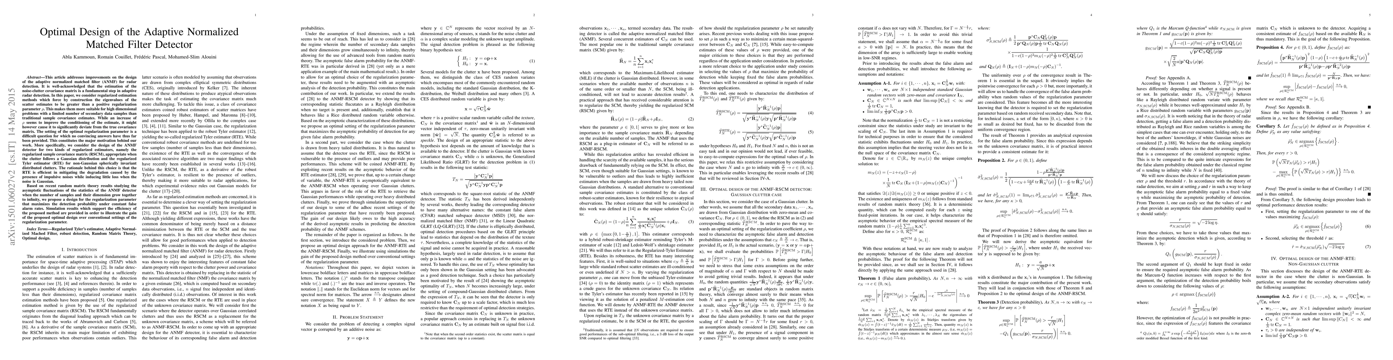 This article addresses improvements on the design of the adaptive normalized matched filter (ANMF) for radar detection. It is well-acknowledged that the estimation of the noise-clutter covariance matrix is a fundamental step in adaptive radar detection. In this paper, we consider regularized estimation methods which force by construction the eigenvalues of the scatter estimates to be greater than a positive regularization parameter rho. This makes them more suitable for high dimensional problems with a limited number of secondary data samples than traditional sample covariance estimates. While an increase of rho seems to improve the conditioning of the estimate, it might however cause it to significantly deviate from the true covariance matrix. The setting of the optimal regularization parameter is a difficult question for which no convincing answers have thus far been provided. This constitutes the major motivation behind our work. More specifically, we consider the design of the ANMF detector for two kinds of regularized estimators, namely the regularized sample covariance matrix (RSCM), appropriate when the clutter follows a Gaussian distribution and the regularized Tyler estimator (RTE) for non-Gaussian spherically invariant distributed clutters. Based on recent random matrix theory results studying the asymptotic fluctuations of the statistics of the ANMF detector when the number of samples and their dimension grow together to infinity, we propose a design for the regularization parameter that maximizes the detection probability under constant false alarm rates. Simulation results which support the efficiency of the proposed method are provided in order to illustrate the gain of the proposed optimal design over conventional settings of the regularization parameter.