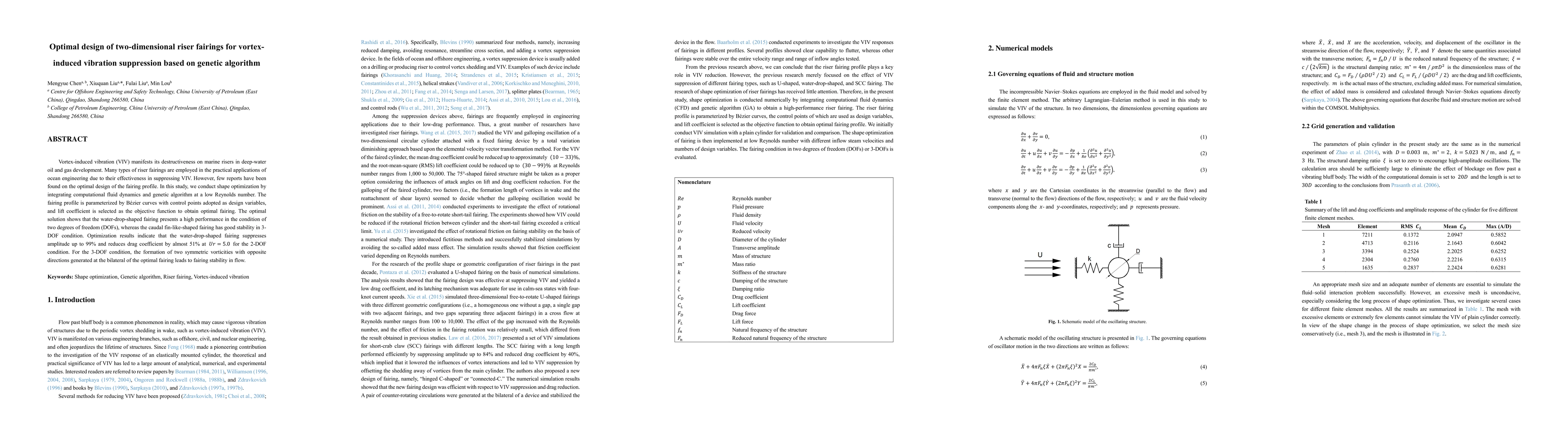 This study optimizes the design of two-dimensional riser fairings for vortex-induced vibration suppression using a genetic algorithm and computational fluid dynamics. The optimal fairing shapes, parameterized by Bézier curves, show that a water-drop shape effectively reduces vibration in two degrees of freedom, while a caudal fin-like shape provides stability in three degrees of freedom.