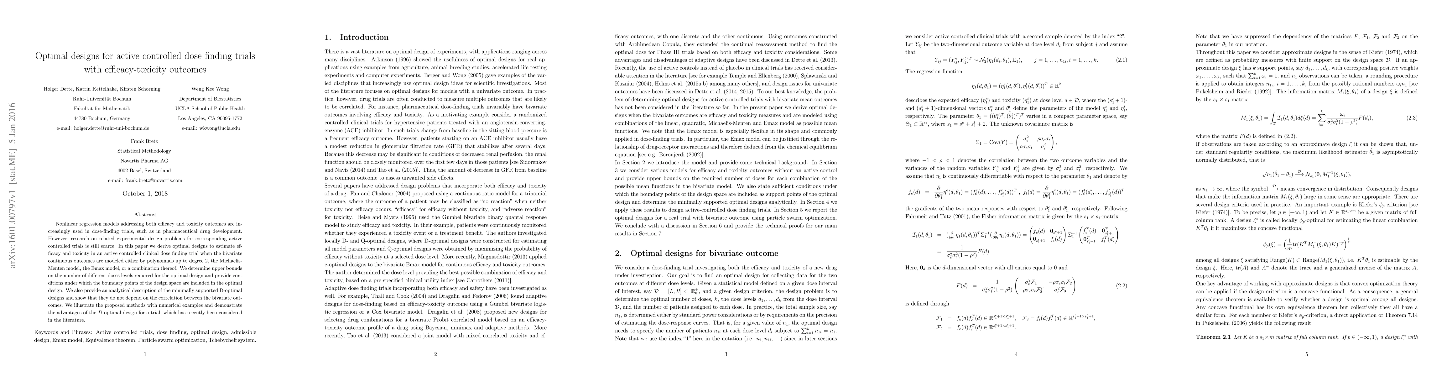 This paper develops optimal designs for active controlled dose-finding trials using nonlinear regression models for efficacy and toxicity outcomes. It provides $D$-optimal designs for various models and demonstrates their advantages through numerical examples.