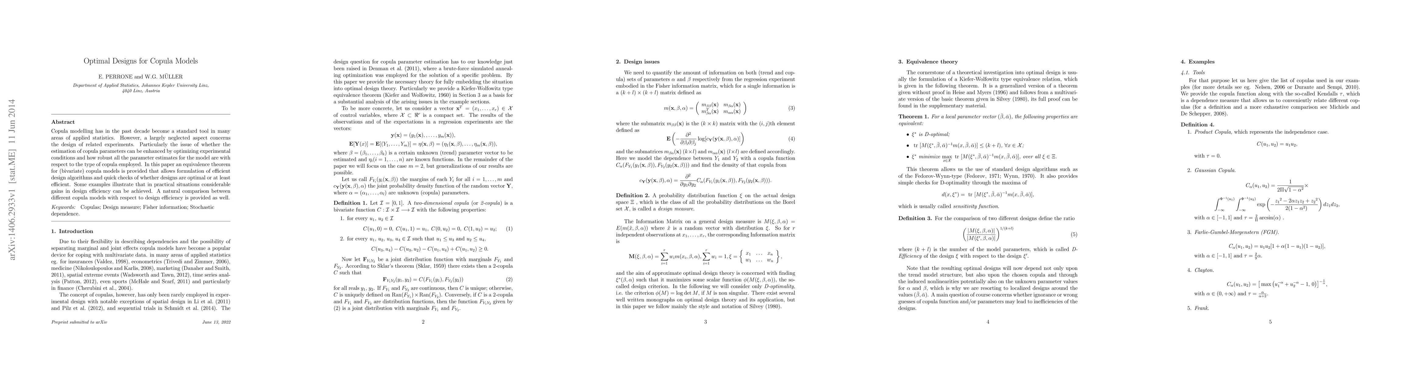 This paper develops optimal design algorithms for copula models, providing an equivalence theorem that facilitates efficient design and robustness checks. It demonstrates significant practical gains in design efficiency and compares different copula models in terms of their design efficiency.