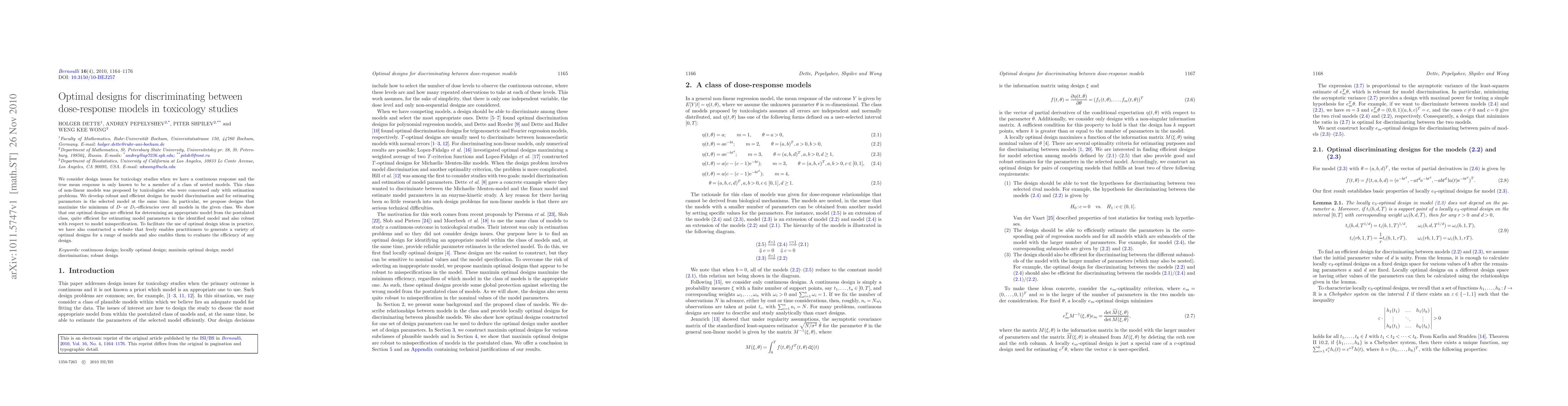 We consider design issues for toxicology studies when we have a continuous response and the true mean response is only known to be a member of a class of nested models. This class of non-linear models was proposed by toxicologists who were concerned only with estimation problems. We develop robust and efficient designs for model discrimination and for estimating parameters in the selected model at the same time. In particular, we propose designs that maximize the minimum of $D$- or $D_1$-efficiencies over all models in the given class. We show that our optimal designs are efficient for determining an appropriate model from the postulated class, quite efficient for estimating model parameters in the identified model and also robust with respect to model misspecification. To facilitate the use of optimal design ideas in practice, we have also constructed a website that freely enables practitioners to generate a variety of optimal designs for a range of models and also enables them to evaluate the efficiency of any design.