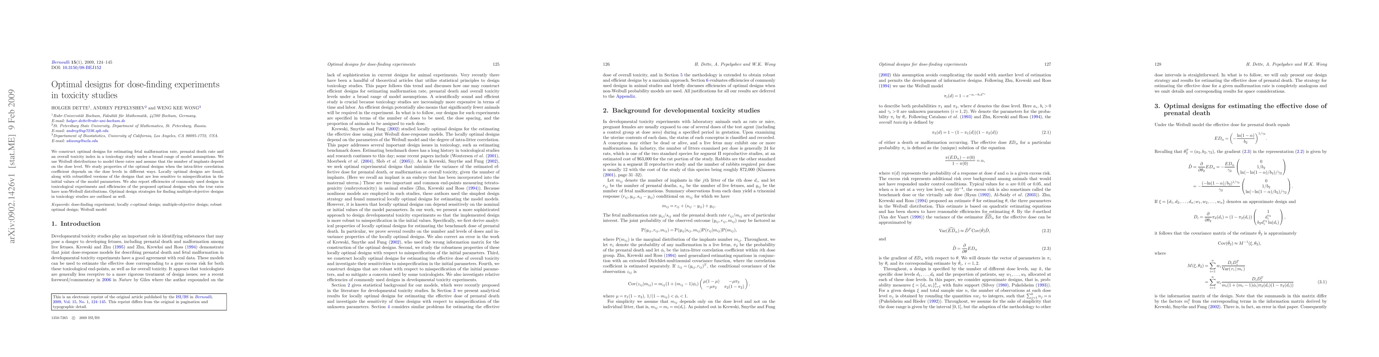 This paper constructs optimal designs for estimating fetal malformation and prenatal death rates in toxicology studies, using Weibull distributions and considering dose-level dependencies. It proposes robustified designs to mitigate parameter misspecification and compares efficiencies with commonly used designs, highlighting strategies for multiple-objective dose-finding experiments.