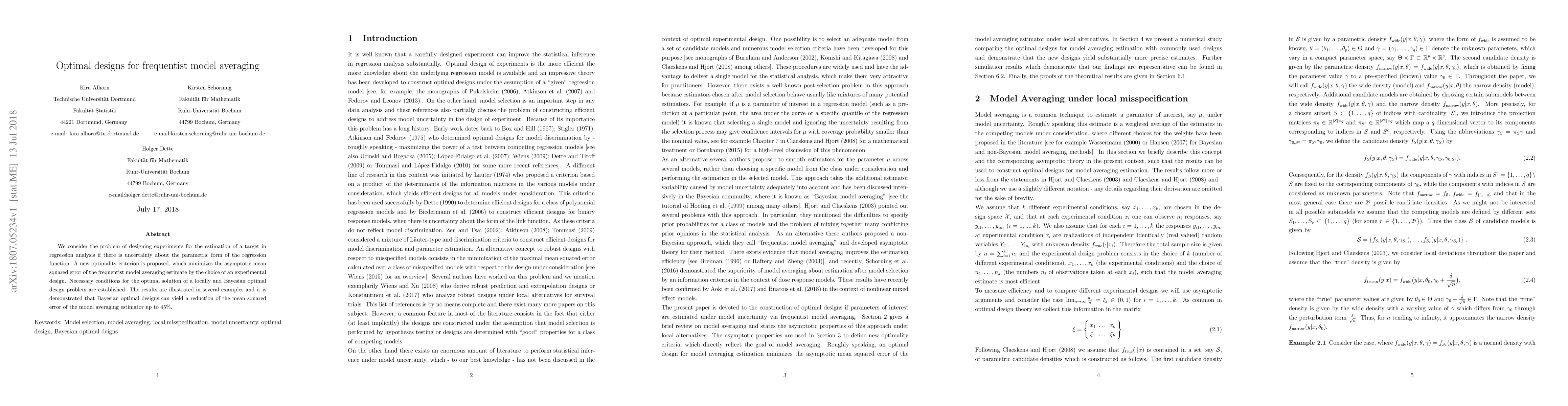 This research introduces a new optimality criterion for designing experiments in regression analysis, considering uncertainty in the regression function's parametric form. It minimizes the asymptotic mean squared error of the frequentist model averaging estimate, showing that Bayesian optimal designs can reduce this error by up to 45%.