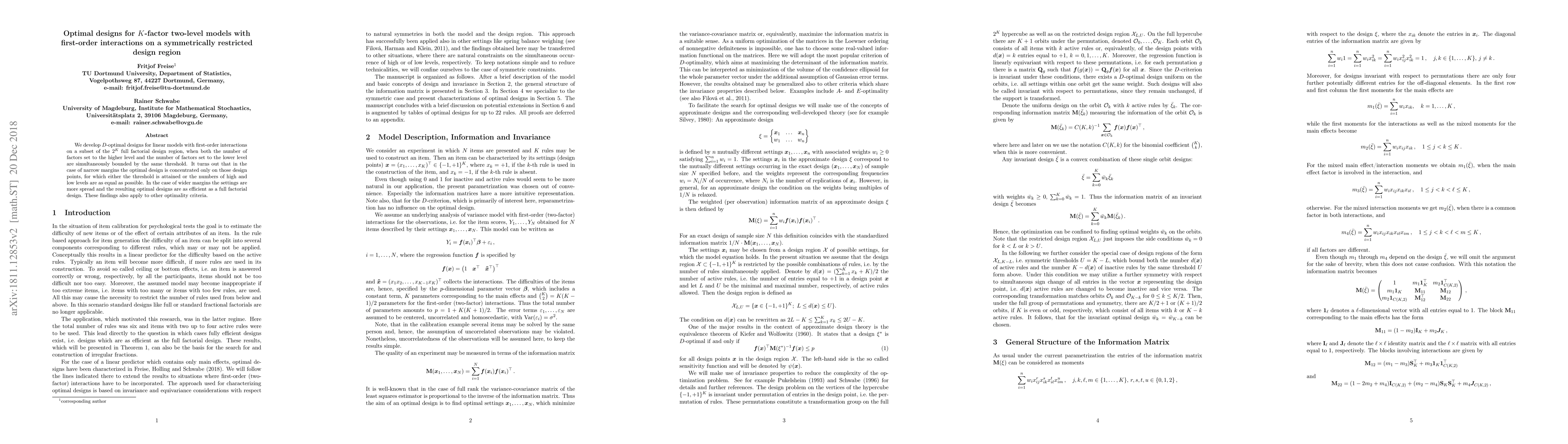 This paper develops $D$-optimal designs for $K$-factor two-level models with first-order interactions under symmetrical restrictions on the design region. The optimal designs concentrate on design points where thresholds are met or balance is achieved, with more spread settings for wider margins.