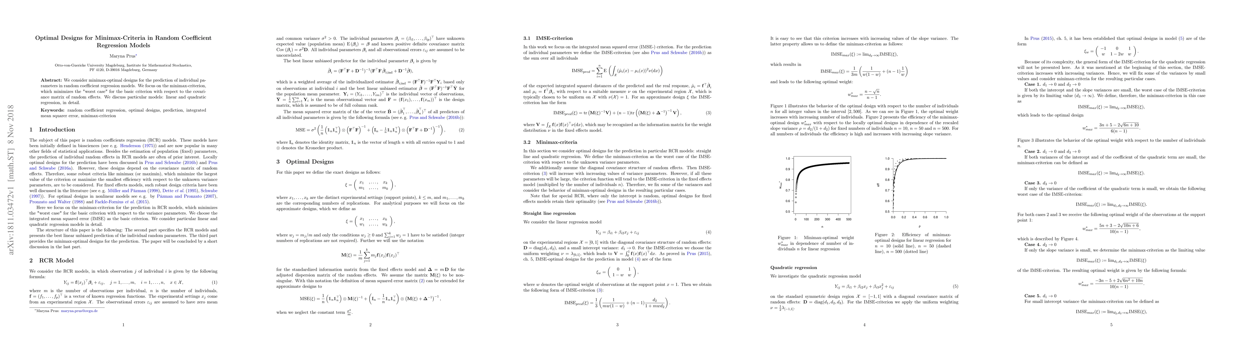 This paper investigates optimal designs for minimizing the worst-case prediction error in random coefficient regression models under a minimax criterion, focusing on linear and quadratic regression scenarios. The study aims to identify designs that effectively handle the variability in random effects' covariance matrix.