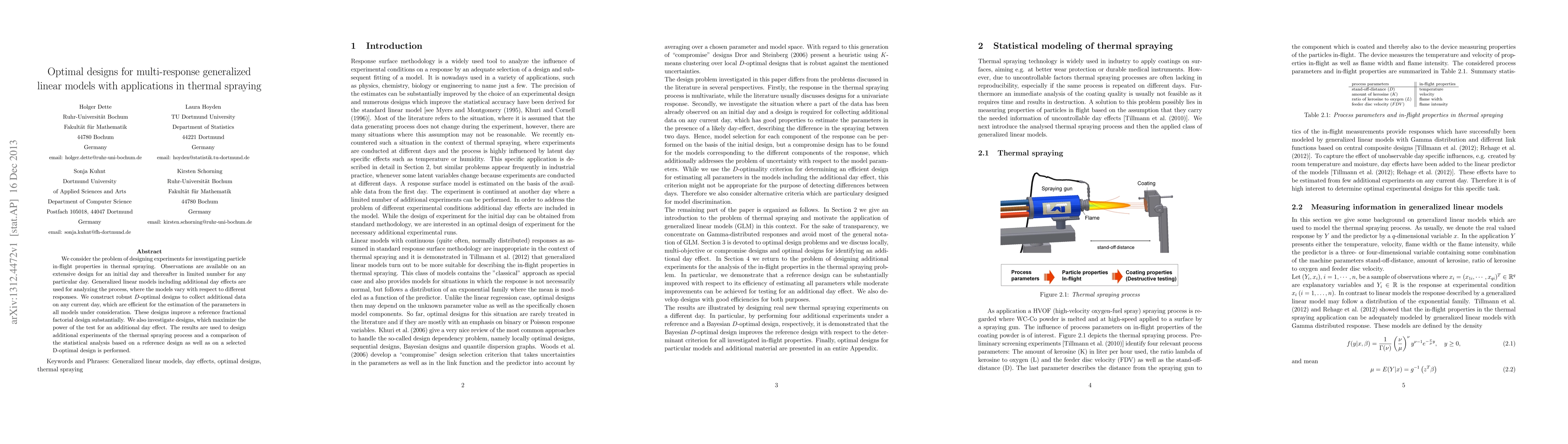 This paper develops robust D-optimal designs for multi-response generalized linear models to enhance the investigation of particle properties in thermal spraying. The proposed designs improve upon a reference fractional factorial design and maximize the power of tests for additional day effects, facilitating better parameter estimation and statistical analysis.