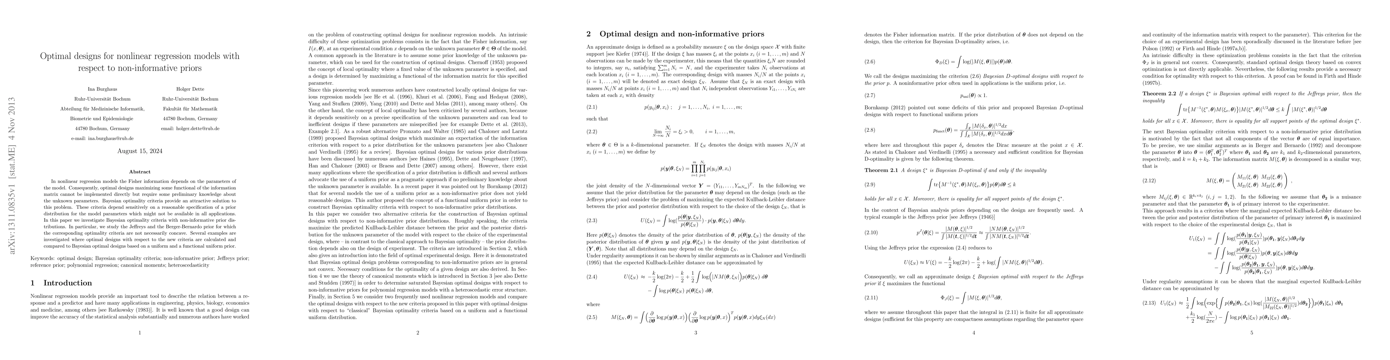 This paper investigates optimal designs for nonlinear regression models with non-informative priors, comparing Bayesian optimality criteria to traditional methods.