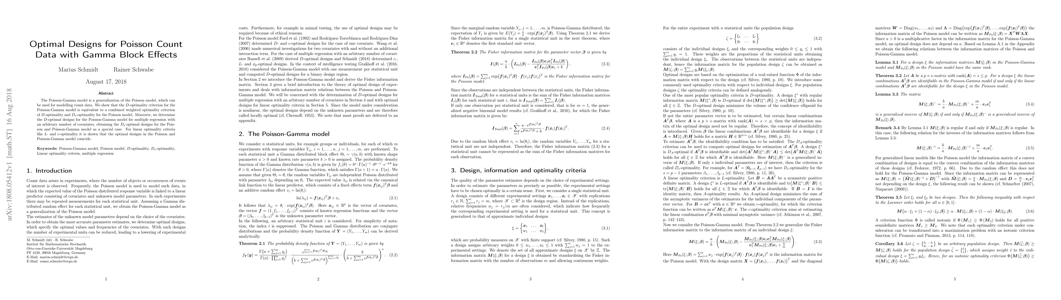 This paper develops optimal design criteria for the Poisson-Gamma model, which can handle count data with gamma block effects, and shows that these criteria coincide with those of its special case, the Poisson model.