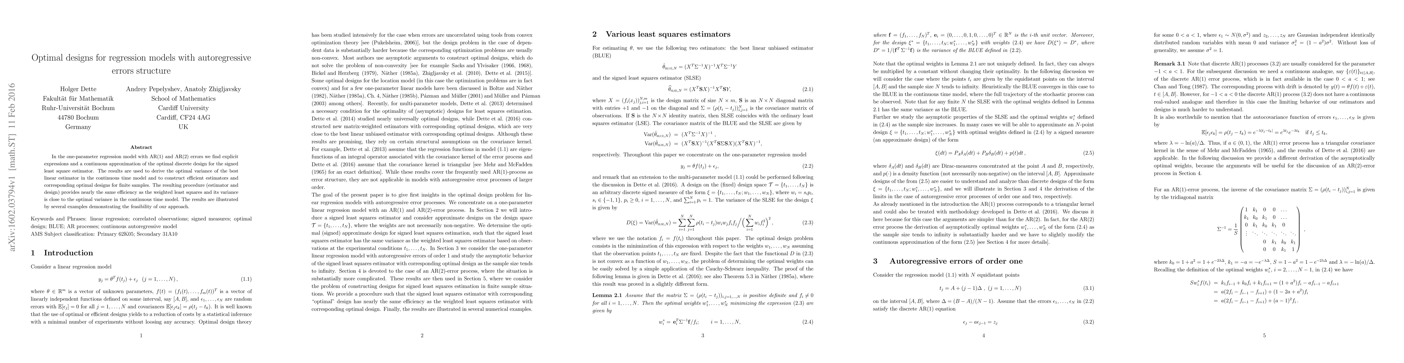 This paper develops optimal discrete designs for regression models with autoregressive errors, specifically AR(1) and AR(2), and constructs efficient estimators that nearly match the efficiency of weighted least squares. The approach is demonstrated through practical examples.