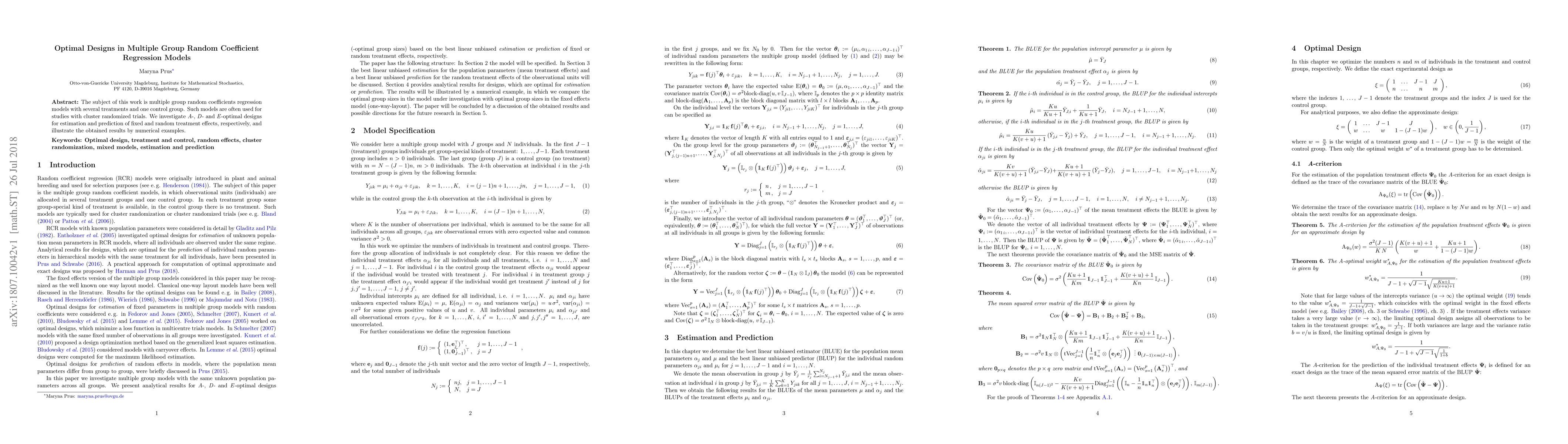 This paper explores optimal designs for multiple group random coefficient regression models, focusing on A-, D-, and E-optimality for estimating and predicting fixed and random treatment effects in cluster randomized trials, with numerical examples to illustrate the findings.