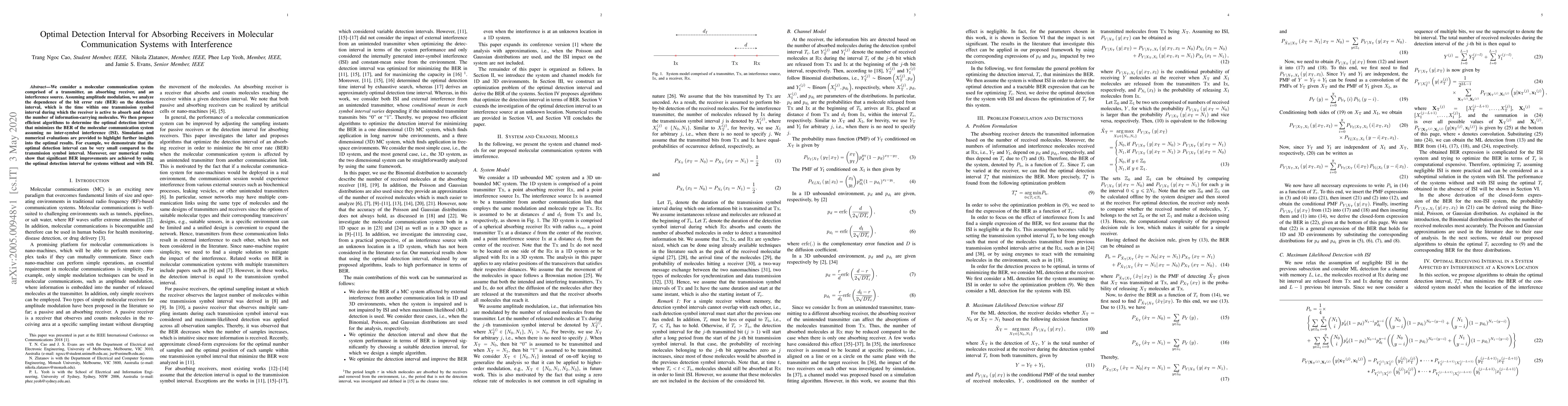 This paper investigates the optimal detection interval for absorbing receivers in molecular communication systems with interference, proposing algorithms to minimize bit error rate (BER). Simulation results show that optimal detection intervals can be much shorter than symbol intervals, significantly improving BER in both interference-free and ISI scenarios.