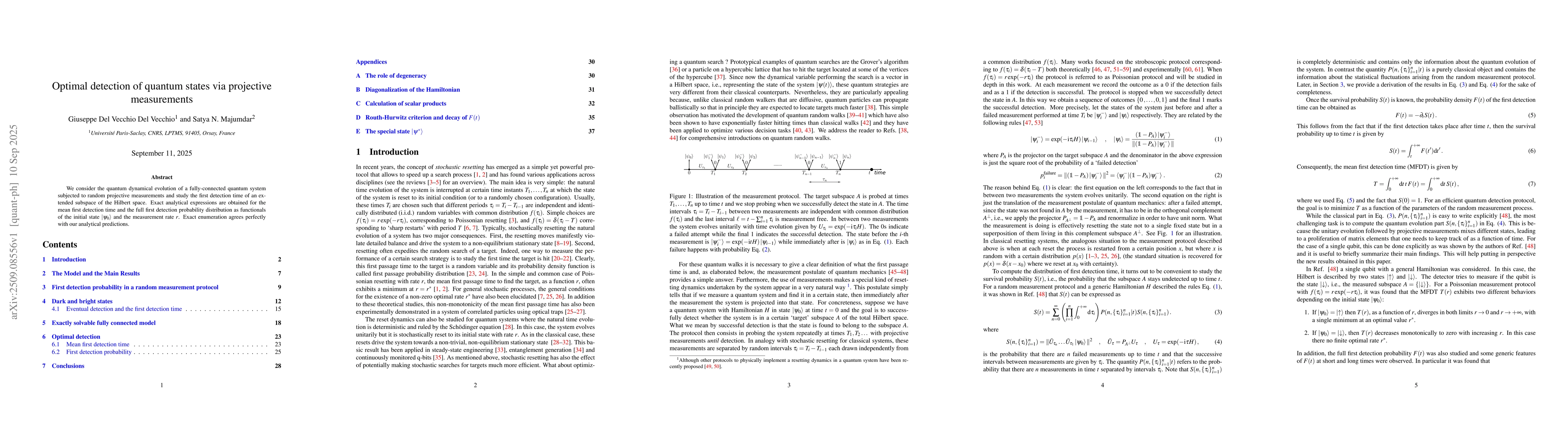 We consider the quantum dynamical evolution of a fully-connected quantum system subjected to random projective measurements and study the first detection time of an extended subspace of the Hilbert space. Exact analytical expressions are obtained for the mean first detection time and the full first detection probability distribution as functionals of the initial state $\ket{\psi_0}$ and the measurement rate $r$. Exact enumeration agrees perfectly with our analytical predictions.